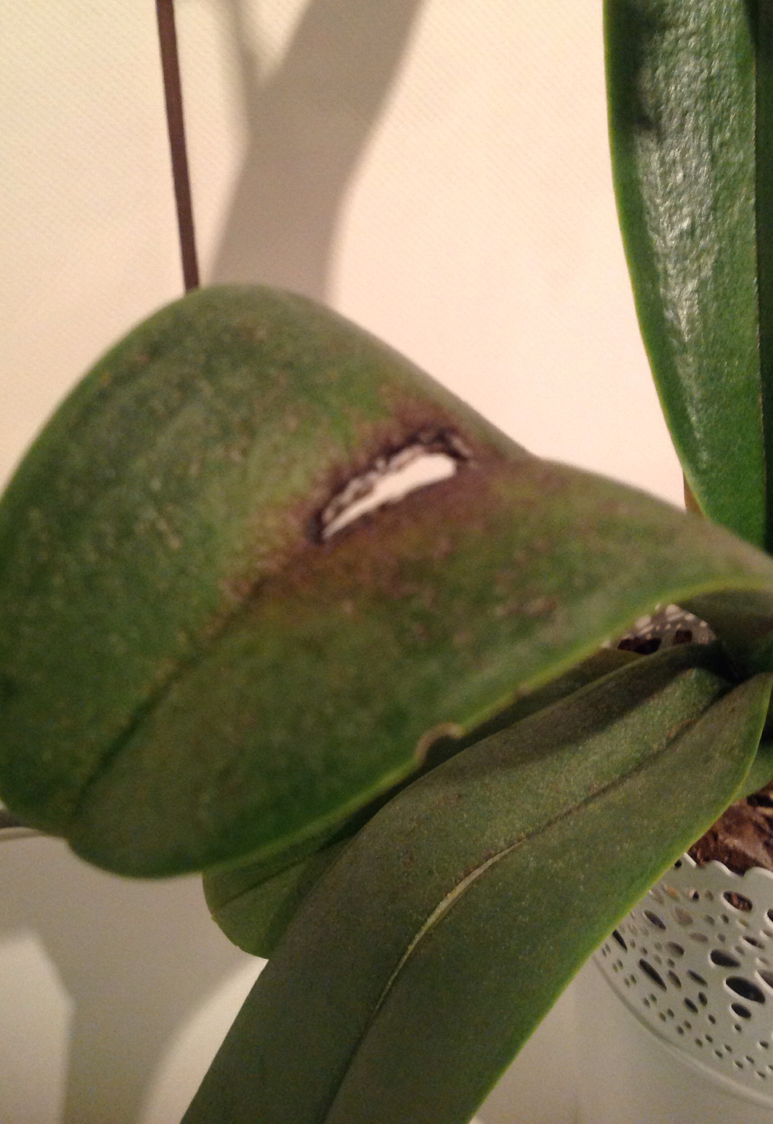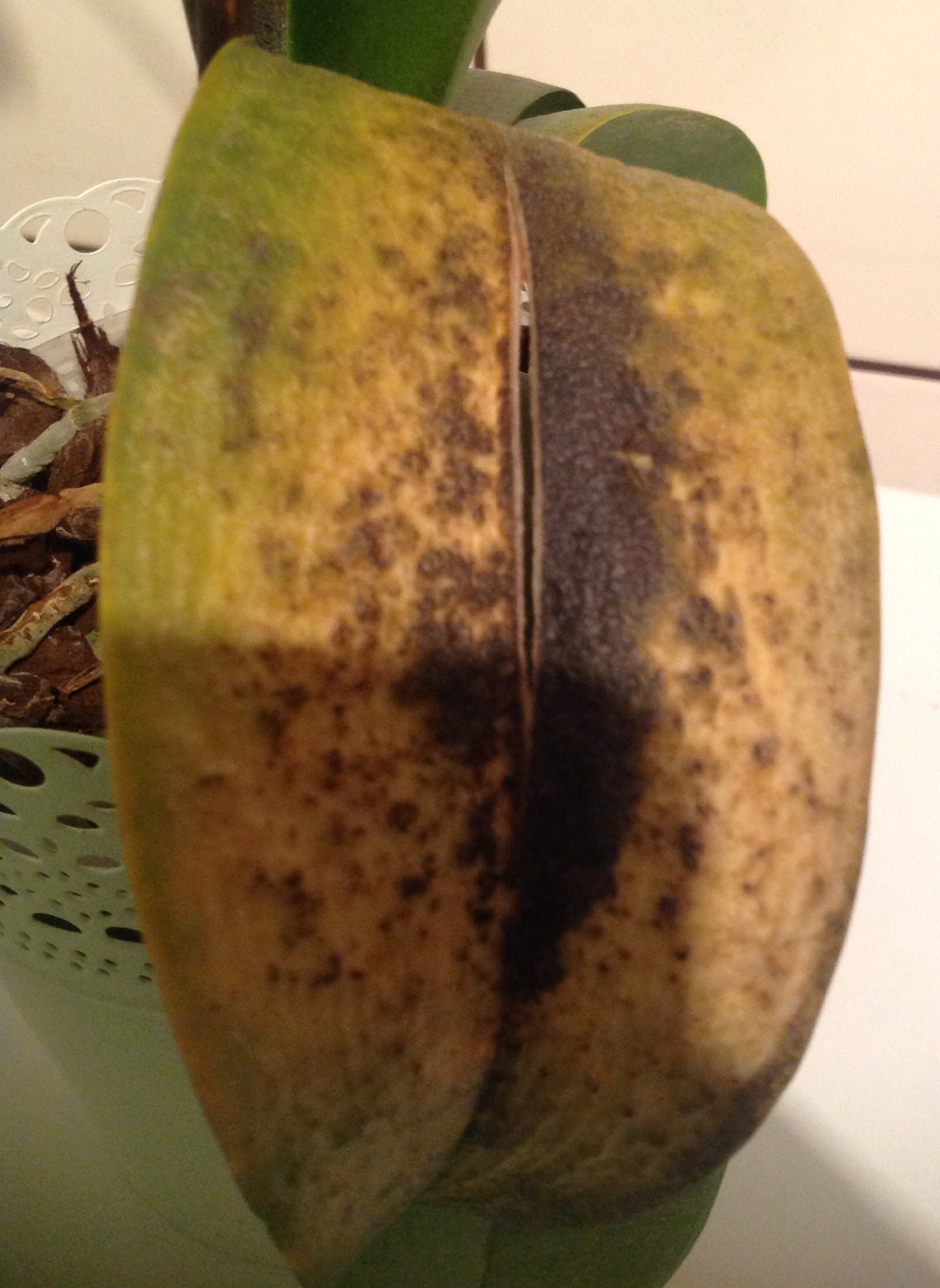 Proszę o pomoc w diagnozie choroby storczyka. Od jakiegoś czasu pojawiają sie plamki na liściach, jednak jeden liść został całkowicie zaatakowany, środkowy, nie jest to liść ani najstarszy ani najmłodszy. Pozornie zdrowe liscie juz na końcach maja jaśniejszy kolor i plamy, a na niektórych pojawiły sie dziury. Wstawiam zdjecia.