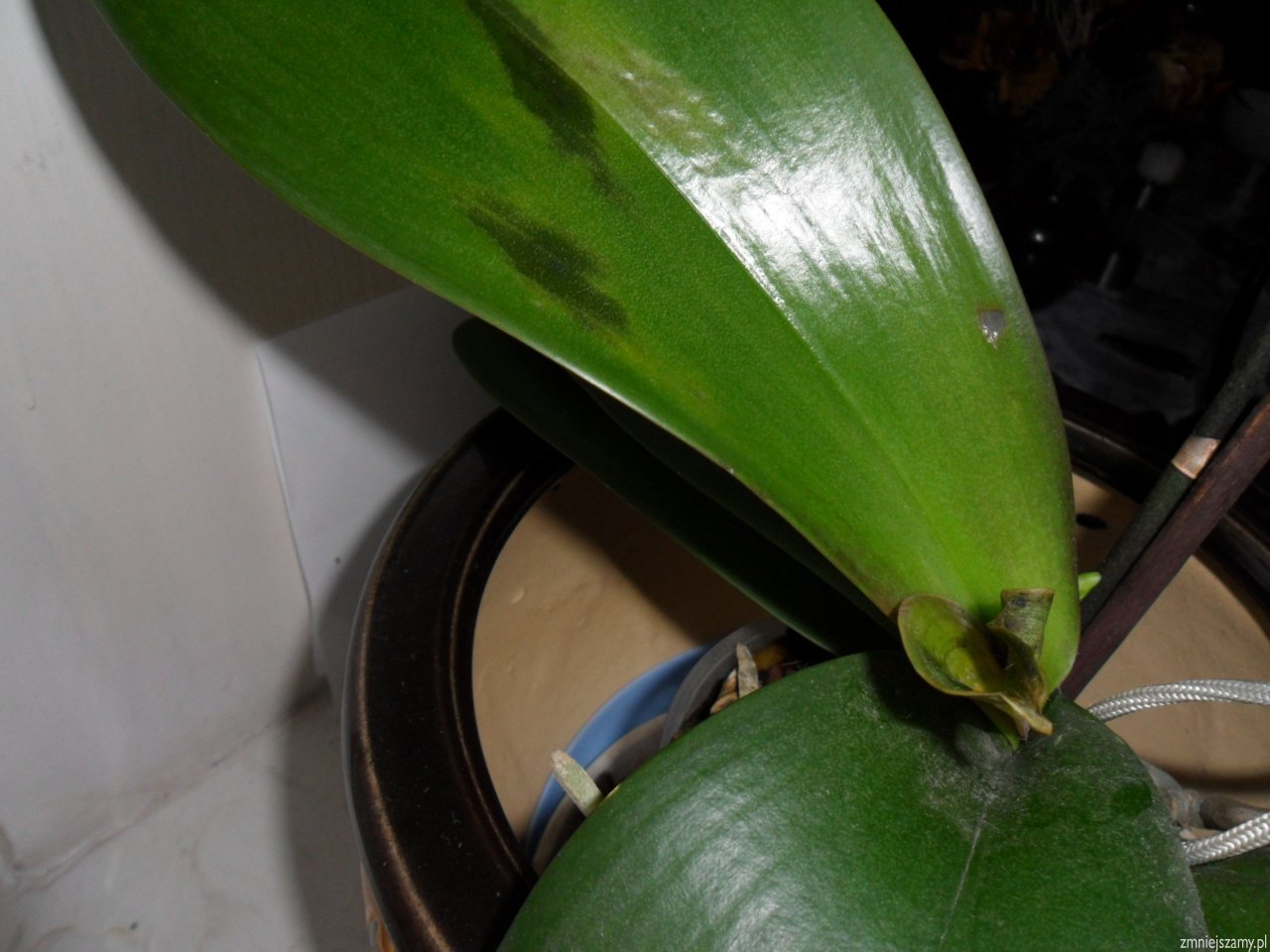 Witam .Mój problem to nie żółte liście ale tak jakby poparzony nowy mały liść i plamy na starszym. Użyłam takie określenia bo najbardziej mi ono pasuje aczkolwiek jest to niemożliwe bo stał storczyk na biurku a i pora roku nie ta. Proszę o podpowiedz .Planuję odcięcie tego liścia a malucha przyciąć .A co o tym sądzicie i co to może być .Może jakaś zaraza? I co zaaplikować mu .Jest w trakcie puszczania pędy kwiatowego. Pozdrawiam Anna