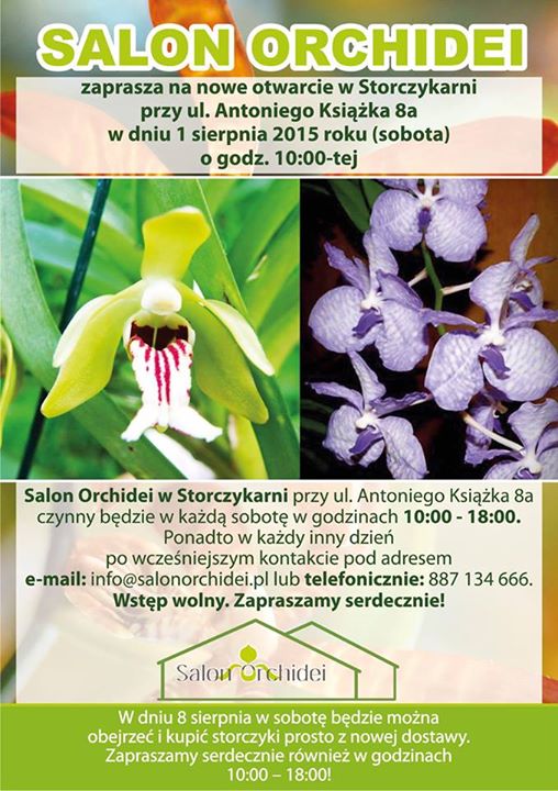 W imieniu firmy Salon Orchidei zapraszam na otwarcie Storczykarni mieszczącej się w Łodzi przy ulicy Antoniego Książka 8a, jak również do zapoznania się z nową listą storczyków na zamówienie:
