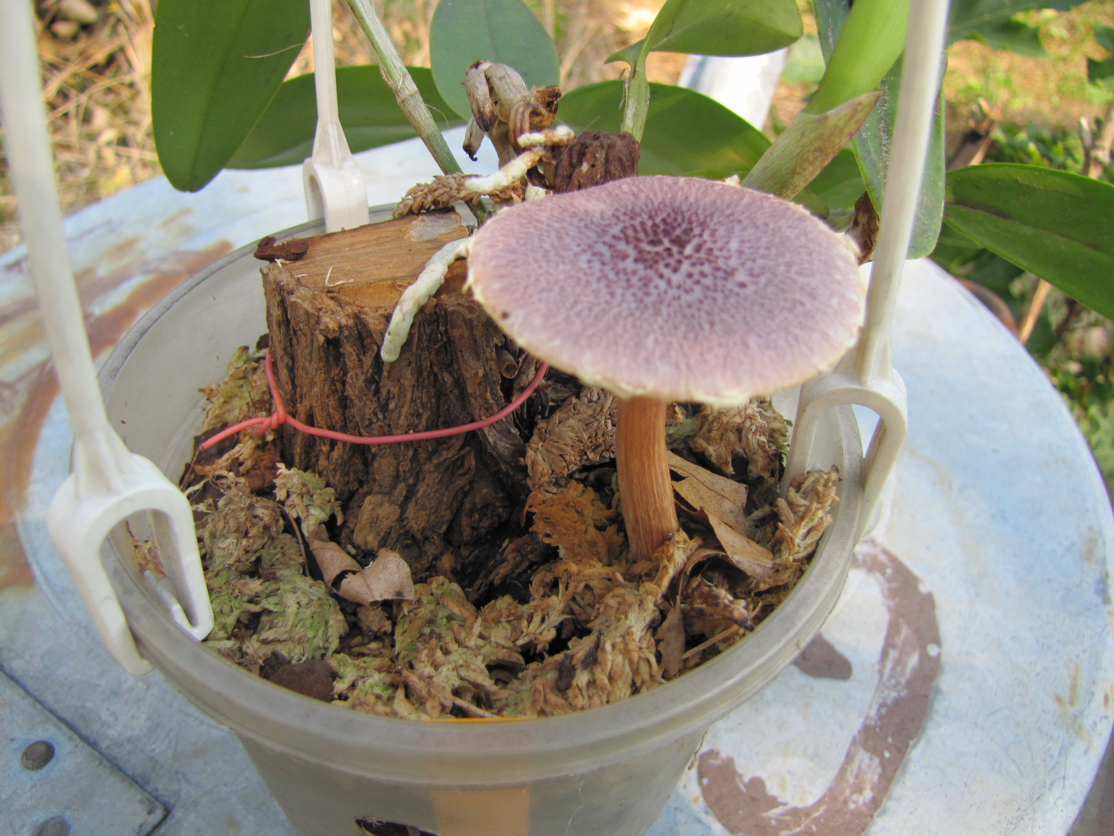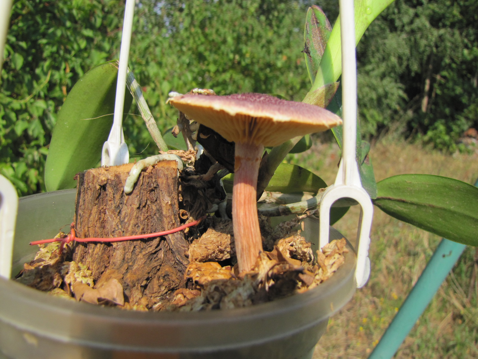 Dzisiaj odkryłem taką, że w doniczce z Cattleya landate wyrósł taki oto grzybek z kapeluszem Może jest to tym spowodowane, że w podłożu jest kawałek drewna z bzu czarnego ?