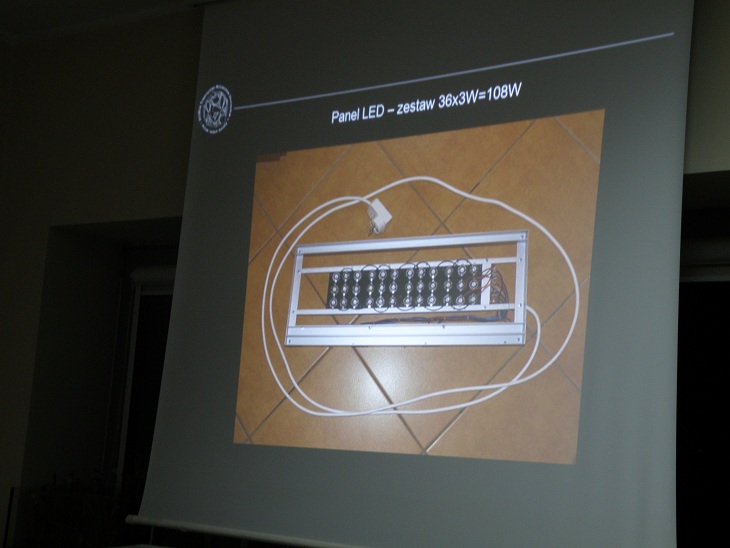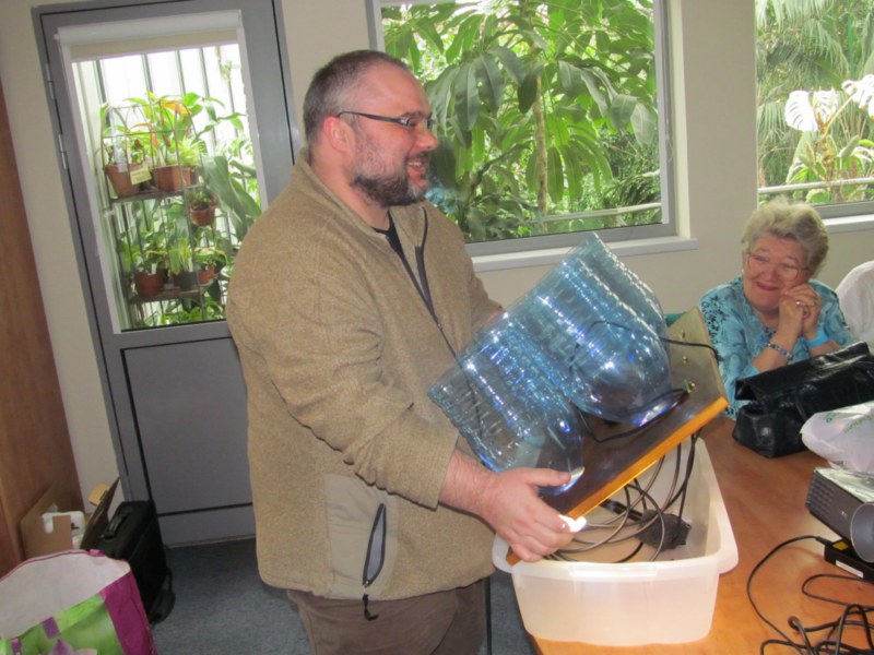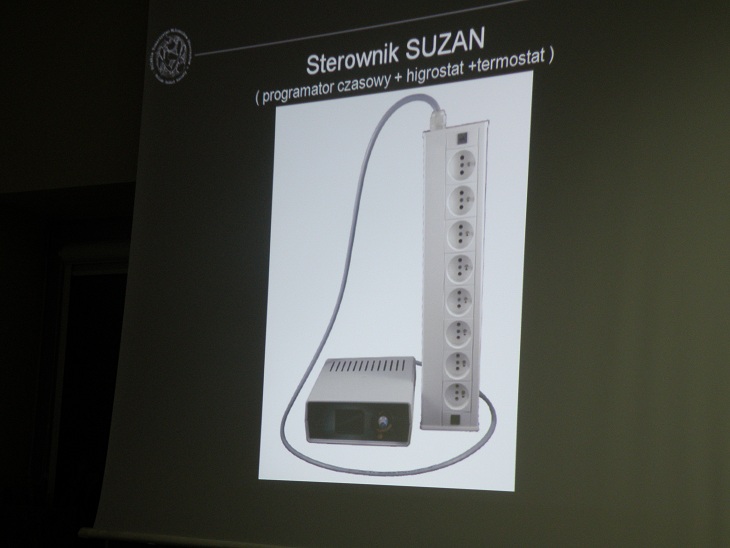 Tomek Makowski zaprezentował własnoręcznie wykonane urządzenie do podlewania vandowatych. Nasz kolega ma niesamowity zmysł techniczny. Pompa znajdująca się na dnie plastikowego pojemnika pompuje wodę do butelek, w których umieszczone są rośliny i automatycznie je podlewa. Częstotliwość podlewania możemy ustawić za pomocą programatora czasowego w zależności od potrzeb.