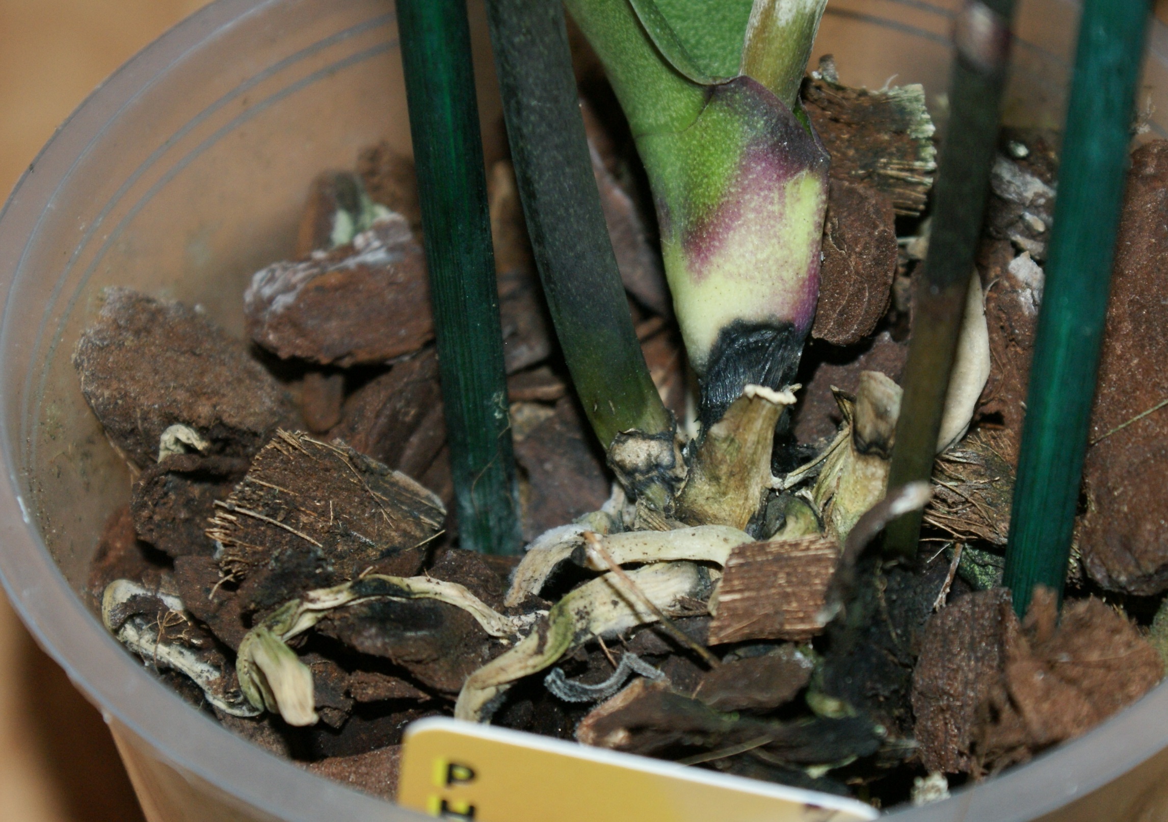 Jak zwał, tak zwał. Bez badania laboratoryjnego nie dowiemy się jaki patogen spowodował takie zmiany. Potocznie, grupowo, określa się takie infekcje jako zgnilizna podstawy pędu. Choroba nieuleczalna. Dochodzi do takich infekcji, kiedy przy zbyt niskich temperaturach woda dostaje się w rozetę liści. A więc to koniec. Prawie. Czasem, z trzonu systemu korzeniowego- jeżeli taki istnieje- storczyk może jeszcze, próbując się ratować, wypuścić pęd. Jeżeli roślina jest bardzo cenna, można zaczekać z wyrzuceniem miesiąc czy dwa, utrzymując umiarkowaną wilgoć w korzeniach.