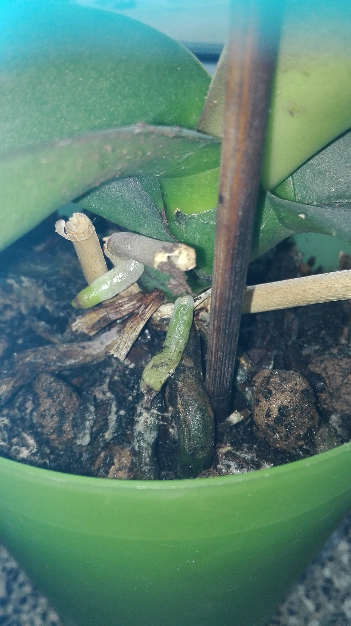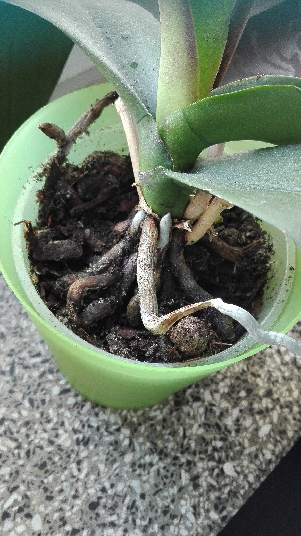 Podloze zupelnie nieprzepuszczalne, zdecydowanie zbyt zbite. Przesadzic, ogarnac korzenie. Nowe zostawic w spokoju, niech sobie rosna. Poczytac o prawidlowej uprawie.