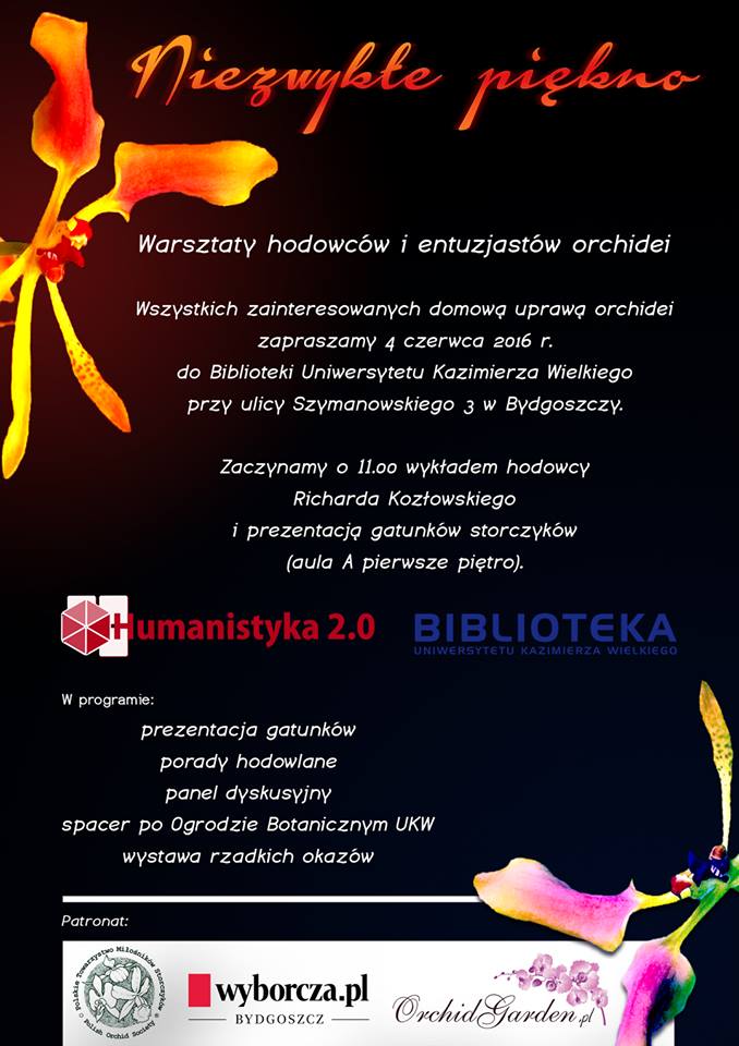Chciałbym zaprosić wszystkich na I storczykowe spotkanie, które odbędzie się w Bibliotece Uniwersytety Kazimierz Wielkiego w Bydgoszczy. Podczas prezentacji będzie mowa o storczykach przystosowanych do uprawy parapetowej. Dodatkowo przez cały dzień będzie możliwość nabycia storczyków botanicznych i hybrydowych. Zapraszam