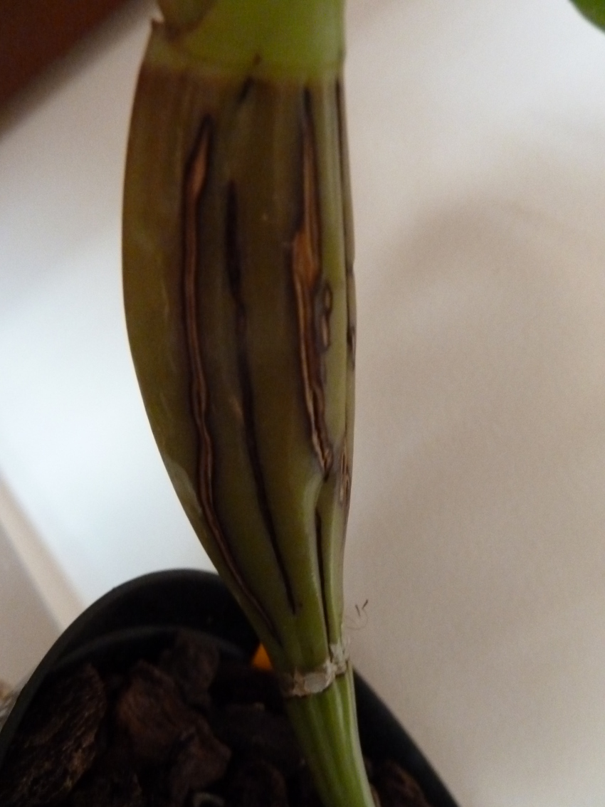 Zaobserwowałem u jednej z moich cattleji wzdłużne pękanie bulw. Pęknięcia pojawiły się na bulwach z letniego przyrostu, te które rosły bardzo dynamicznie. Bulwy zimowe są cieńsze i nie widać tych pęknięć.