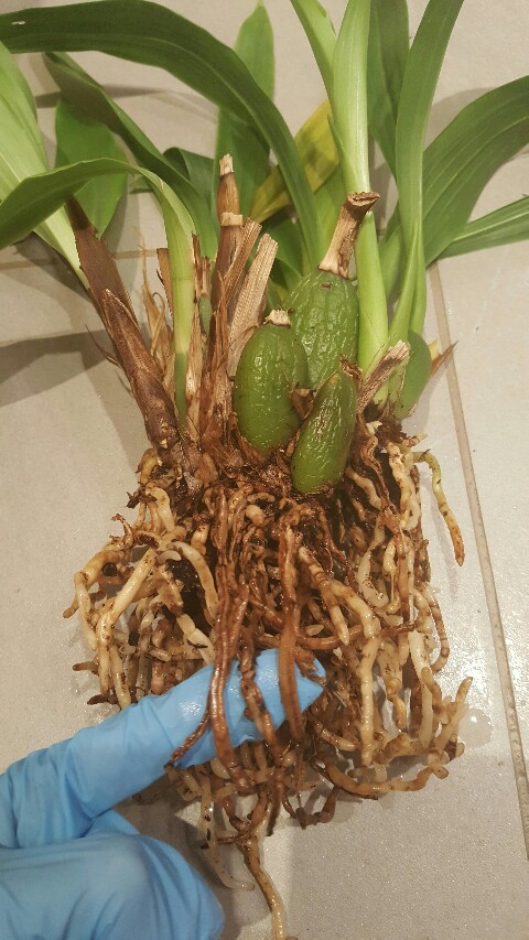 Wyjęłam storczyka z kory. Cała się obsypała. Korzenie były lekko wilgotne, nie zasuszone. Zrobiłam wszystko, zeby nie uszkodzić ani jednego korzonka. W środku zero szkodników w korze jak i na korzeniach. Ja przynajmniej nie widzę. Korzenie jak na moje oko nie wyglądają źle. Jest kilka miękkich, ale one idą od zielonych bulw, a nie tych czarnych. Cała reszta korzeni jest jędrna. Dlaczego te bulwy czarnieją to ja nie mam pojęcia. Nie wiem co to za wypukłe prążkowane kropeczki na liściach ( brązowe lub czarne, pojedyńcze.) To jakaś odmiana tarcznika.? Nie wiem do jakiej kory go przesadzić drobna z seramisem.? Gruba z seramisem, czy sama kora gruba w ogóle bez seramisu. ?.