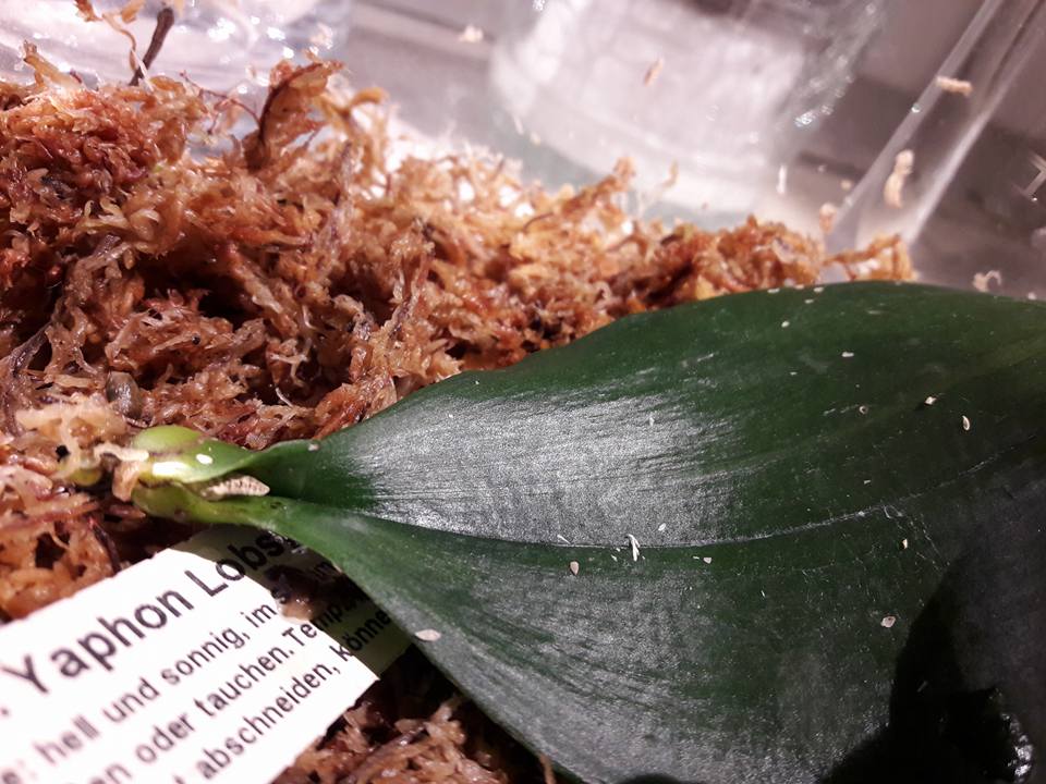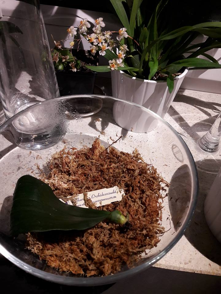 Bałam się pleśni na dole trzonu, więc z paska plastiku zrobiłam podkładkę pod końcówkę trzonu, a nieco wyżej otuliłam go mokrym sphagnum. Całość przykryłam w miarę dopasowaną drugą szklaną miską. Zabieg z antybiotykiem powtarzałam co drugi dzień, 3 razy. Liść wracał na miejsce w misce, zwilżałam codziennie torf i zraszałam liść, uważając, żeby nie zmoczyć stożka wzrostu. Liść zachowywał ciemnozielony kolor i był jędrny, a koniec trzonu - jasnozieleny, twardy, lekko błyszczący. Minimalnie wystający fragmencik nowego pędu nie obumarł i nie zgnił.