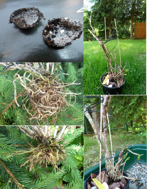 Na zdjęciach od góry po lewej widać jakiś grzybek. Występował tylko na łupinach po orzechach pistacjowych (były wygotowane), Następne to korzenie - większość martwa, zapewne w wyniku zbytniej wilgotności. I ostatnie - korzenie po zabiegu i kąpieli w previcurze. Wyciąłem też zasuszone psb. Roślinę posadziłem w grubej korze z niewielką domieszką sphagnum.Stoi w skrzynce z mokrym żwirem. Teraz czekam co będzie, ale mam złe przeczucia.
