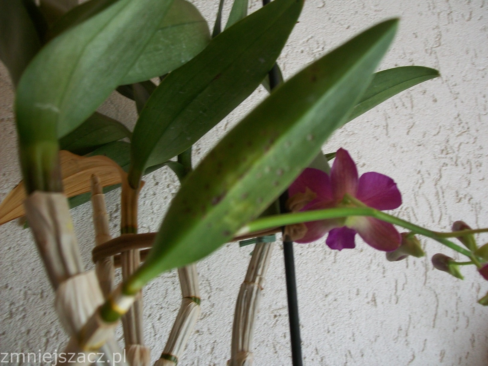 od kilku lat mam u siebie Dend. typu phalaenopsis. Roślina do niedawna ładnie rosła i pięknie kwitła. Stoi w pobliżu południowego okna, Rośnie w doniczce w korze mieszanej grubości. Podlewana jest raz na tydzień wodą z filtra dzbankowego. Co drugie/trzecie podlewanie nawożona połową zalecanej dawki nawozów (Agrecol, Florovit czasami Biohumus). Od pewnego czasu na mołdych liściach zaczęły się pojawiać czarno - brązowe plamki. Ich ilość na tych liściach stopniowo się powiększa aż liść żókłnie i usycha. Spryskałam roślinę Topsinem i powtórzyłam oprysk po 10 dniach. Zasmarowałam też zmiany nalewką propolisową, jednak ilość plamek powolutku się zwiększa. Proszę o pomoc, gdyż chciałabym uratować roślinę (jest ładnie rozrośnięta oraz stanowi pamiątkę). Oczywiście przeczytałam stosowne opracowania w bibliotece, jednak nie bardzo wiem co mogę zrobić jeszcze i ew. jakie inne środki miałyby uzasadnione zastosowanie po tych, których już użyłam.
