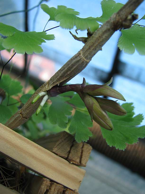 Z podobną sytuacją spotkałem się u Dendrobium primulinum, które przyjechało do mnie zimą, w trakcie zimowania i trafiło do ciepełka. Wtedy to zakwitło jednym kwiatem, a gdy usechł dopiero okazało się że ten kwiat zakwitł na dopiero wybijającym się keiki. Ciekawe, czy to będzie tak samo teraz wyglądało ( wyznaję zasadę, że keiki są zawsze miło widziane, jeśli wszystko inne gra