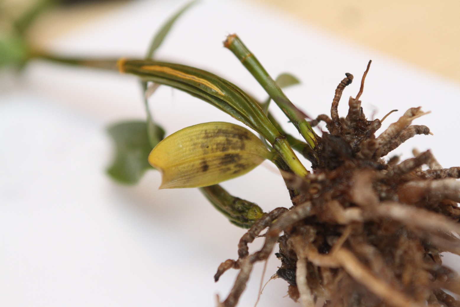Storczyka kupiłem z orchidgarden, po przyjściu wyglądał ok (nie miał żółtego liścia) na plamy może nie zwróciłem uwagi. Posadzony był tylko w mchu i po jego rozmoczeniu (był bardzo zbity) i delikatnym wyłuskaniu właśnie takie korzenie mi się ukazały a i tak dużą ich część po prostu usunąłem bo były wręcz poczerniałe. Zakupiłem go jako Dendrobium i podejrzewam iż jest to gatunek sprzedawany bo jedna psb która się odłamała w transporcie miała kwiat (staram się ją uratować i obciąłem pęd kwiatowy aby wzmocnić roślinkę). Dziś rano jeszcze zauważyłem iż u Dendrobium signatum które zakupiłem jednocześnie również zaczął mocno jaśnieć jeden liść. Nie wiem czy to wina miejsca ale w tym miejscu kiedyś rosły felki i nigdy nie było z nimi problemu. Teraz stoją tak dwie cattaleye dwa felki i coś co dostałem od znajomej i nie mam pojęcia co to jest ale też wszystko rośnie jak głupie. Naprawdę mi szkoda roślinek i chciałbym pomóc im jak tylko mogę.