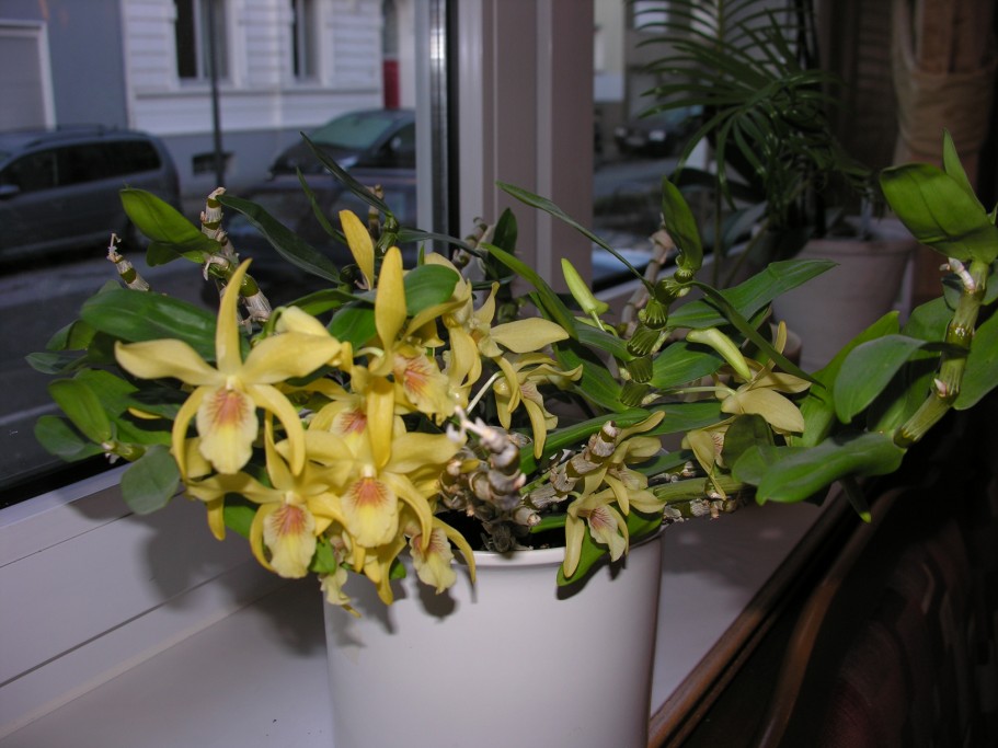 Od lat jeżdżę na targi do Essen na przełomie stycznia i lutego i śpię zawsze w tym samym hotelu i od lat zawsze kwitnie w tym czasie stojący na tym samym oknie, w tymże hotelu Dendrobium Stardust. W tym roku wyjątkowo mizernie. Zapytana gospodyni nie umiała mi powiedzieć jak go pielęgnuje. Po prostu, podlewa jak wszystkie kwiatki, bez żadnych spoczynków. Podłoże nie zmieniane nigdy. I gdzie tu jest sprawiedliwość? Człek chuch i dmucha, a moje D. Stardust pożałowania godne.