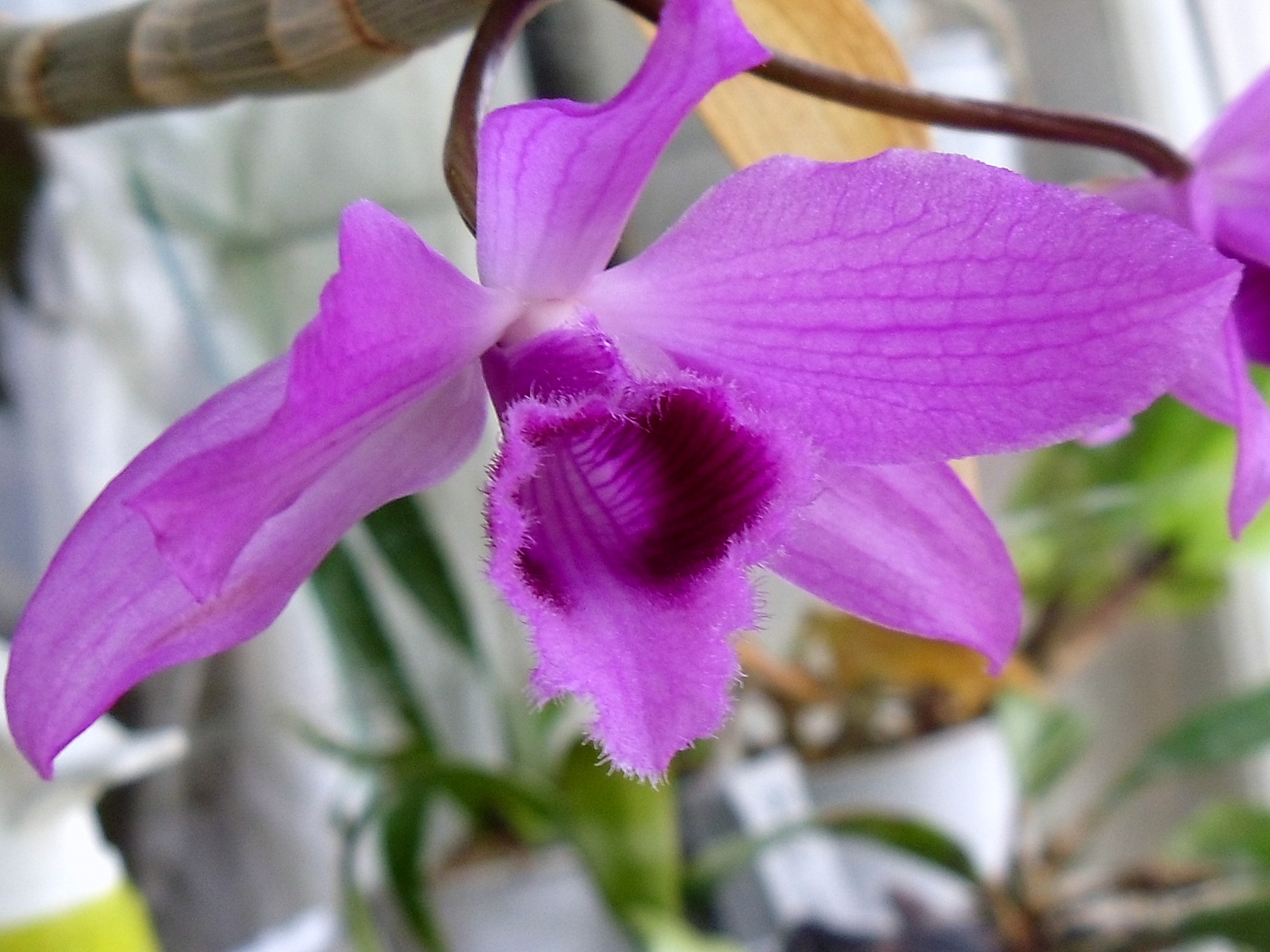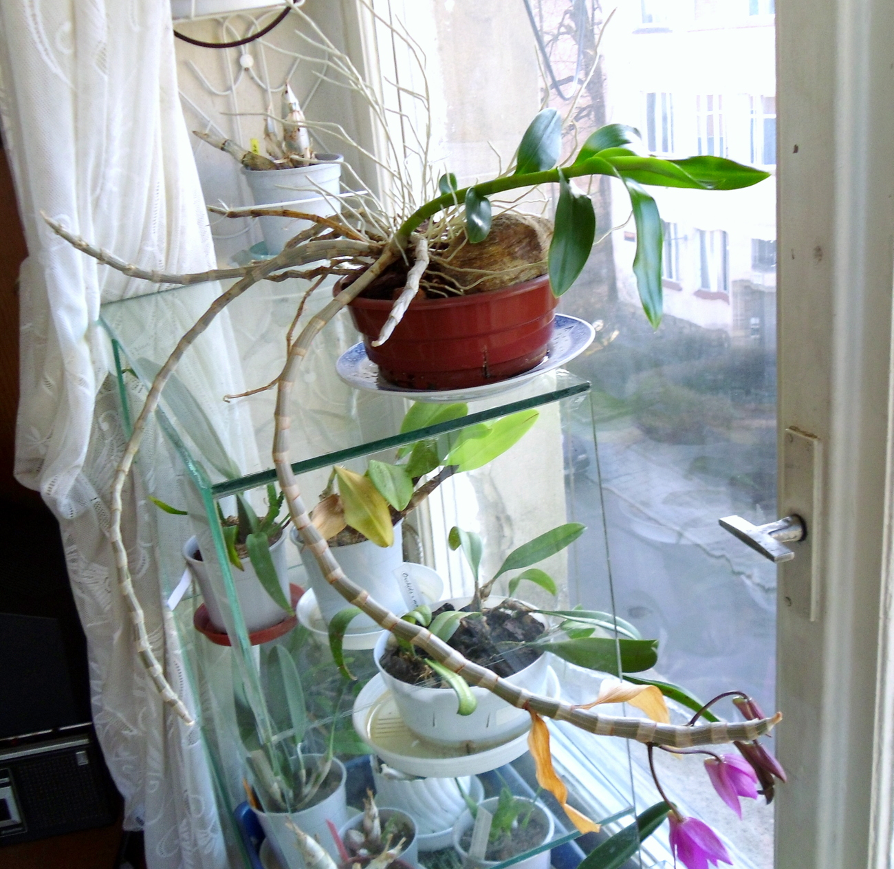 Kupiłam tę roślinę na wystawie w Lodzi w 2009.III. Osadzona była na sporej płycie korkowej i miała wełnowce oraz ślimaki. Pierwszy rok przyzwyczajała się do życia w donicze. Jak wełnowce łatwo dokonały żywota po 0,5 brykiecika Tarcznika, to dopadły ją moje przędziorki. Liście łatwo się zmywa mokrym wacikiem ale w 2009r nie zakwitła a ja się jej uczyłam. Nie wolno przecierać pseudobulw bo wtedy uszkadzeniu ulegają zalążki kwiatów. W lecie potrzebuje dużo świeżego powietrza i stosunkowo niskiej temperatury. Na lato przestawiam ją na wschodnie okno klatki schodowej.Tam czasem jej pseudobulwy nawet kołyszą się na przeciągach, a w upały czerwcowe słońce od rana do południa praży je niemiłosiernie. Wilgotność powietrza jest naturalna 50-90%. Potrzebuje wtedy dużo wody i nawożenia co 2 tygodnie. Gdy widzę że wzrost jest intensywny to zasilam je co tydzień ale wtedy trzeba przeprowadzać kąpiele bryły korzeniowej w wodzie zdemineralizowanej. Gdy stosunkowo szybko przyrasta nowa, gruba psb o lśniących liściach, to znaczy że warunki są prawidłowe. Na początku września zabieram ją do pokoju z północnym oknem i temp ~20*C gdzie mam stosunkowo najwyższą wilgotność powietrza.....30-40% w zimie! Powoli zmniejszam dawki wody, nie zasilam, obserwując korzenie powietrzne. Gdy zielone końcówki skracają się, częściej zraszam roślinę wodą zdemineralizowaną. W styczniu liście gwałtownie zaczynają zółknąć i w ich kątach w lutym ukazują się pąki kwiatowe. Kwiaty z bliska pachną musztardą, w odległości 1m dochodzi zapach malin. Najintesywniej wydzielają zapach w czasie słonecznej pogody, póżnym popołudniem. Wtedy mogą wypelnić nim cały pokój, jest przyjemny, taki intrygujący. Kwitnienie trwa ~3 tygodnie.