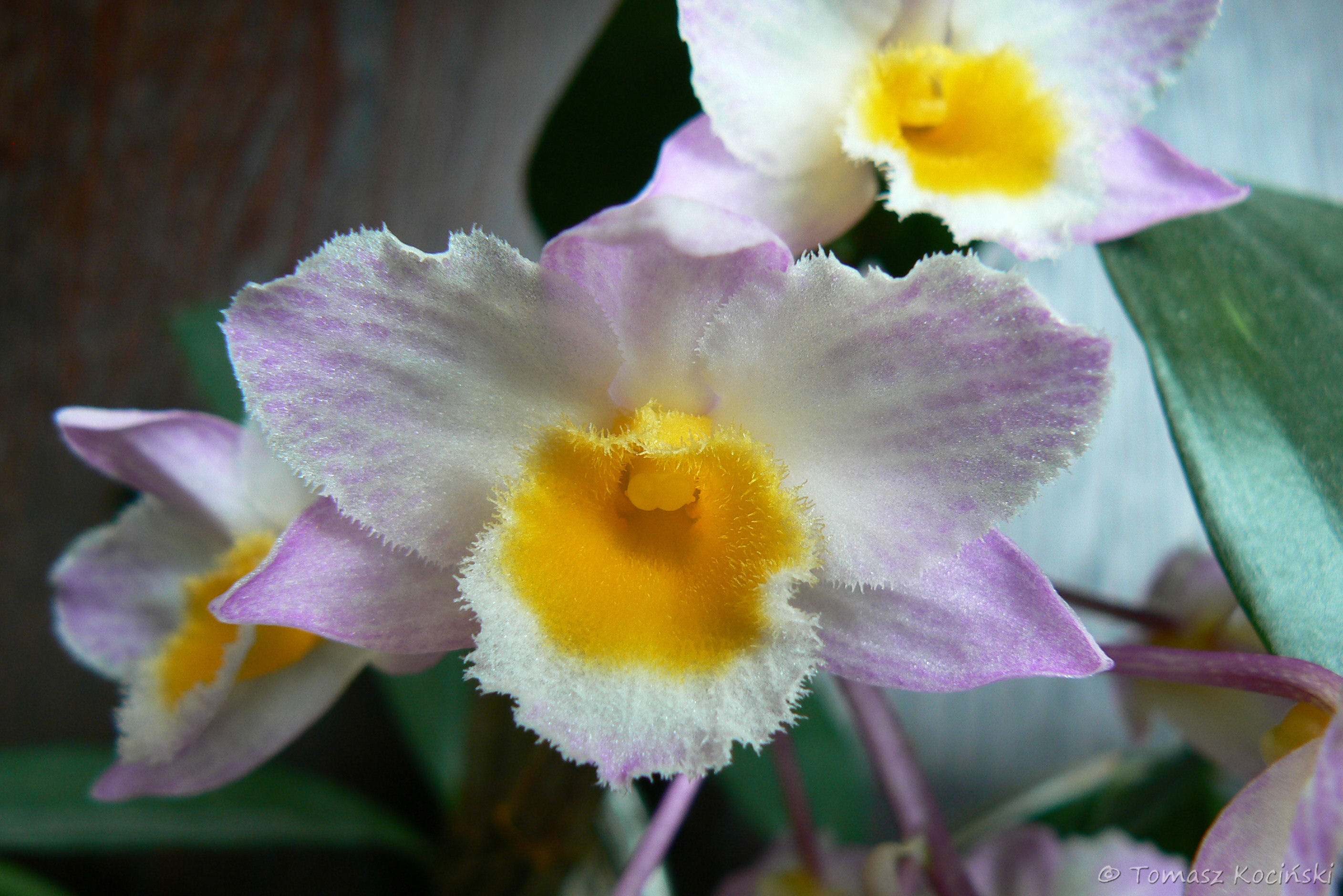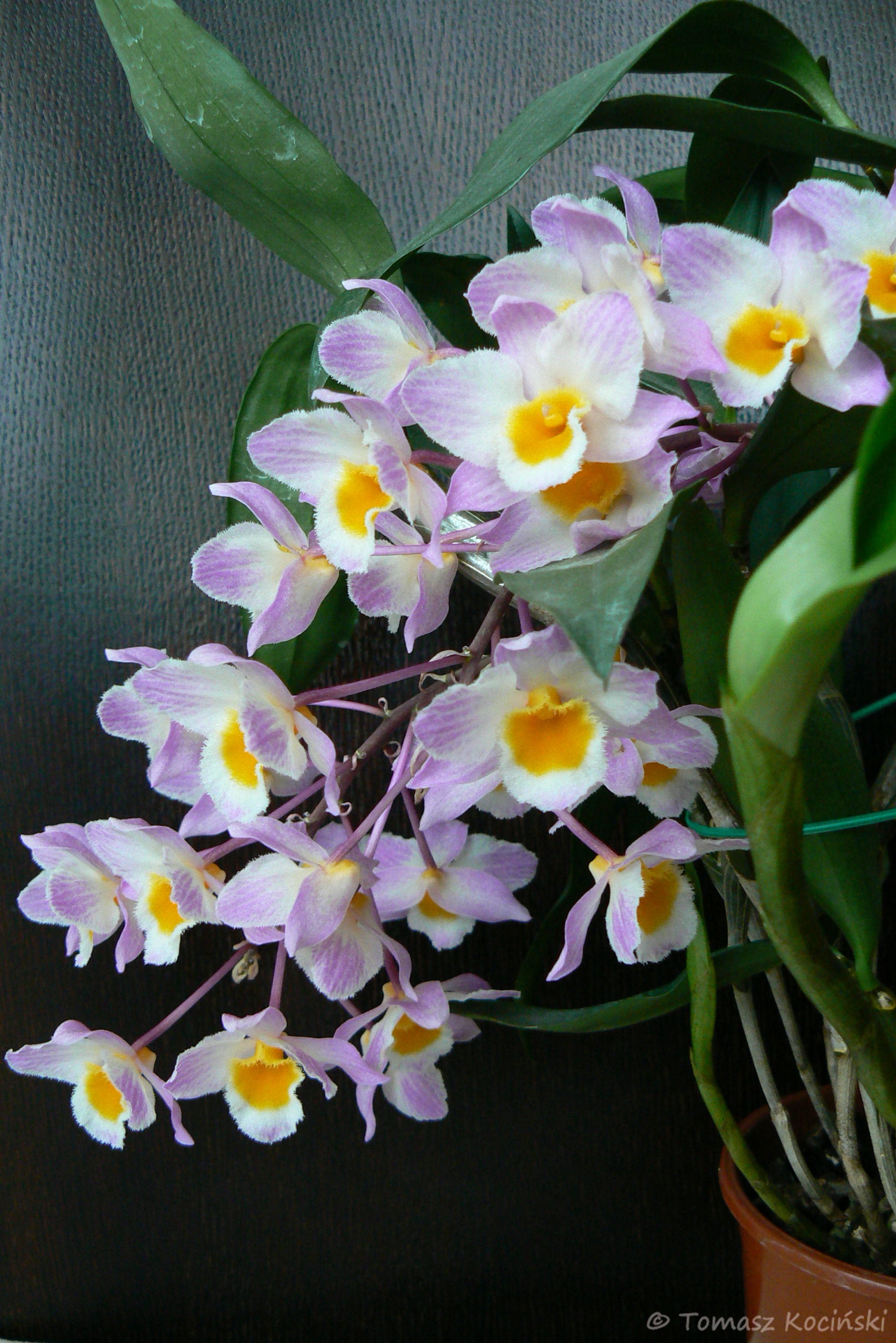 Dendrobium znajduje się w pomieszczeniu z innymi storczykami, a więc nie ma specjalnych warunków. Wisi sobie 1,5 metra od południowego okna, pod lampą doświetlającą rośliny w zimie.