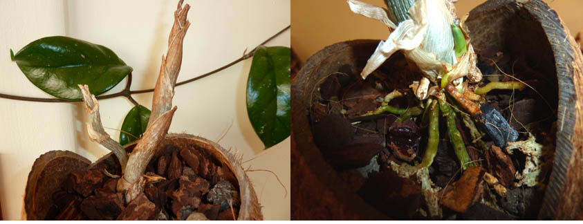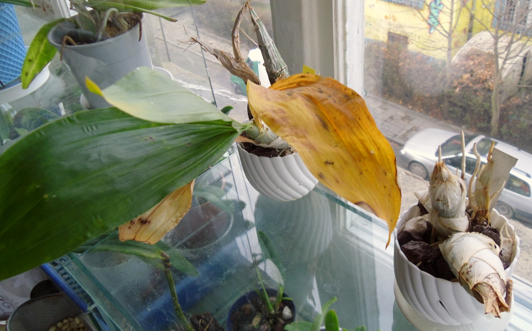 2. Sposoby na wprowadzenie w okres spoczynku. Rośliny, które nie zakwitły w lecie, obojętnie z jakich powodów, przedłużają wegetację i liście mają dalej zielone, już bez turgoru z powodu zmniejszonej ilości wody ale uparcie nie chcą spać. Tak jakby starały się wytworzyć kwiaty pomimo naszego krótkiego dnia. Przestrzegam przed obcinaniem zielonych liści i żywych korzeni. Tak wprowadziłam na siłę, w spoczynek w 2010/2011r, moje Catasetum ochraceum. Od wiosny było bardzo rachityczne i dopiero pod koniec lata, w prawdziwej szklarni, odżyło. Daliśmy mu wolną rękę, niech robi co chce, choć dostaje mniej wody.