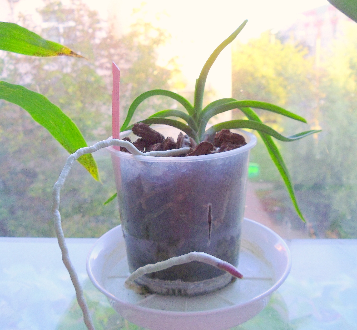 Dla porządku napiszę że ta krzyżówka powstała z Neofinetia falcata i Rhynchostylis coelestis. Mój egzemplarz jest młodociany, rośnie skokami bo a to stoi, a to w ciągu paru dni wytworzy ~0,5 cm liścia. Kiedyś uprawiałam neofinetię i też tak dziwnie skokowo rosła.