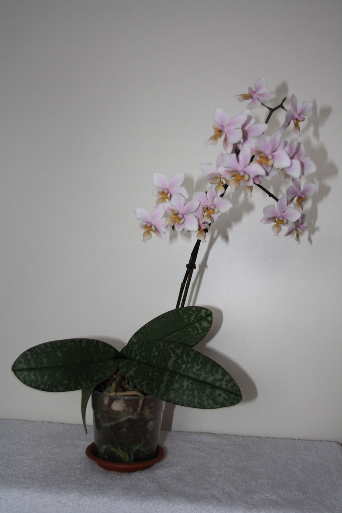 Kupiona w kiepskim stanie, z licznymi brązowymi plamami (tak, wiem, że ryzyko, ale tania była ;)) i ślimakami. Kuracja Topsinem pomogła. Roślina nie mieściła się w doniczce, więc od razu poszła do przesadzenia. Po wyjęciu rozpadła mi się na 2 części, jedną wsadziłam do świeżego sphagnum, bo wcześniejsze podłoże to też sam mech był, drugą, miejszą, do kory zmieszanej z mchem. Zakwitła mi ta, która jest tylko w mchu. Druga rosła wstecz, ostatni zielony piździk przesadziłam do samego mchu jakieś 2 tygodnie temu- już widac różnicę. Wschodnie okno w kuchni, stale rozszczelnione albo otwarte jak tylko temp. wzrosła powyżej zera (mamy problem z grzybem pod parapetem :/), prawie cały czas woda stoi w spodku.