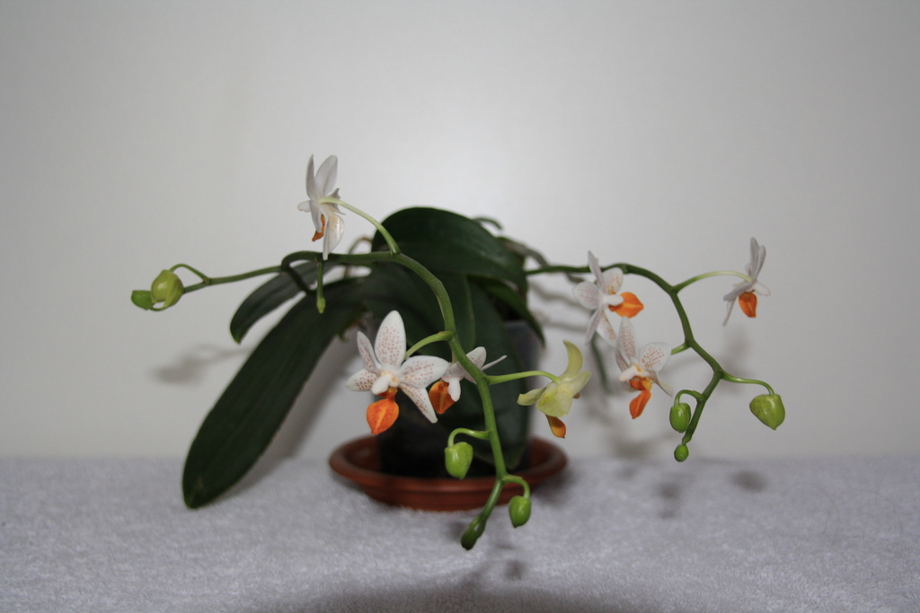 Kupiona w kiepskim stanie, z licznymi brązowymi plamami (tak, wiem, że ryzyko, ale tania była ;)) i ślimakami. Kuracja Topsinem pomogła. Roślina nie mieściła się w doniczce, więc od razu poszła do przesadzenia. Po wyjęciu rozpadła mi się na 2 części, jedną wsadziłam do świeżego sphagnum, bo wcześniejsze podłoże to też sam mech był, drugą, miejszą, do kory zmieszanej z mchem. Zakwitła mi ta, która jest tylko w mchu. Druga rosła wstecz, ostatni zielony piździk przesadziłam do samego mchu jakieś 2 tygodnie temu- już widac różnicę. Wschodnie okno w kuchni, stale rozszczelnione albo otwarte jak tylko temp. wzrosła powyżej zera (mamy problem z grzybem pod parapetem :/), prawie cały czas woda stoi w spodku.