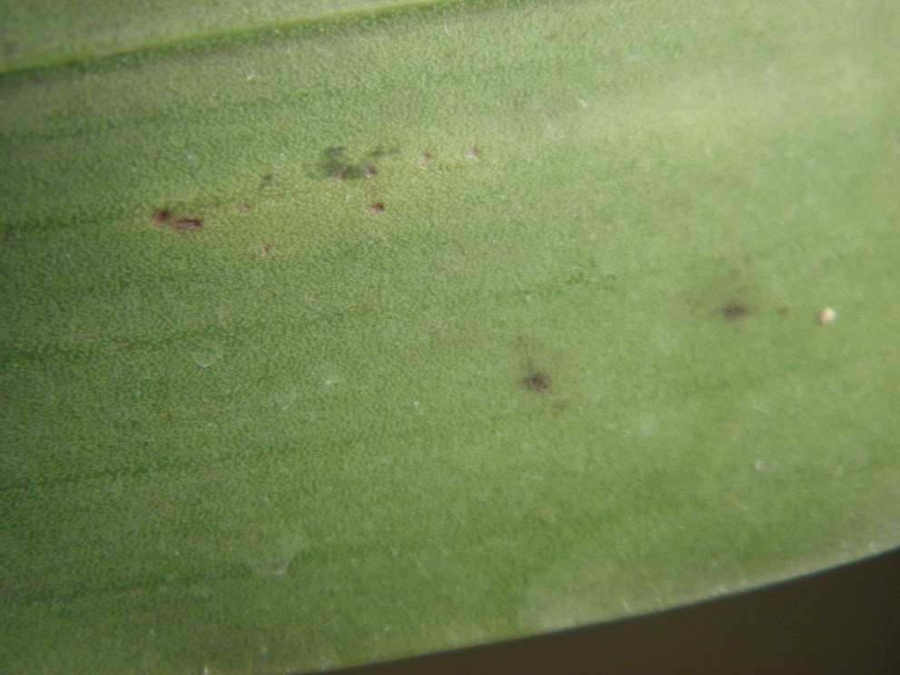 Niestety, wygląda na to, że tak jak Michał wspomniał jakieś patogeny zaczynają pakować się do środka. W prawdzie plamki, prawie nie zmieniają się (wieczorem zrobię zdjęcia żeby porównać), ale powstają kolejne z małym ciemnym punkcikiem w środku sugerującym atak grzyba. Dodatkowo, te stare, nie zasychają a chyba powinny gdyby nie było tam jakiś patogenów, które atakują roślinę od środka (tak mi się wydaje). Za to robią się prawie przeźroczyste. Nie ma to jakiegoś dramatycznego przebiegu. Nie mam doświadczenia i nie wiem w jakim tempie takie zakażenie zazwyczaj postępuje, bo na moje oko to ten przypadek jest skrajnie powolny. W sieci widziałem artykuły, mówiące że zakażenie bakteryjne może zniszczyć roślinę w trzy dni. Dlatego nadal mam nadzieję, że to nie bakterie. Tak czy siak przydałoby się zadziałać, co najmniej prewencyjne przeciw grzybom i bakteriom. Czyli niestety chemioterapia, żeby zapobiec powstawaniu nowych ognisk. Myślę, że Miedzian 50 lub Miedzian Extra 350 powinny być dobre, oba ponoć działają na grzyby i bakterie. Szperając w sieci dowiedziałem się, że bakterie u roślin są nie do wyleczenia, bo nie ma antybiotyków a istniejące preparaty mogą tylko przeciwdziałać zakażeniu a nie leczyć już zakażone tkanki. Zatem jeśli to nie pomoże to będzie trzeba chwycić za skalpel wyciąć porażone miejsca a może nawet cały liść. A potem pewnie znów chemia. Ehh… zaczyna to przypominać oddział intensywnej terapii.
