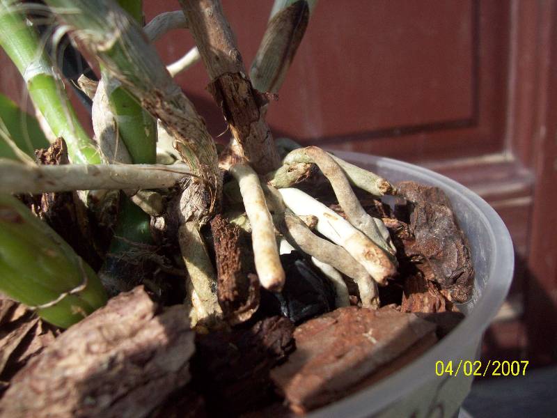 Muszę przyznać, że w roku ubiegłym zakupiłem w sklepie internetowym hybrydę laeli, której podłoże było dostosowane do warunków domowych, czyli duże kawałki kory z pinii i ze zdrowymi korzeniami :!: Niestety, już w momencie kupna często część korzeni jest martwa i to głównie ze zbyt mokrego podłoża.