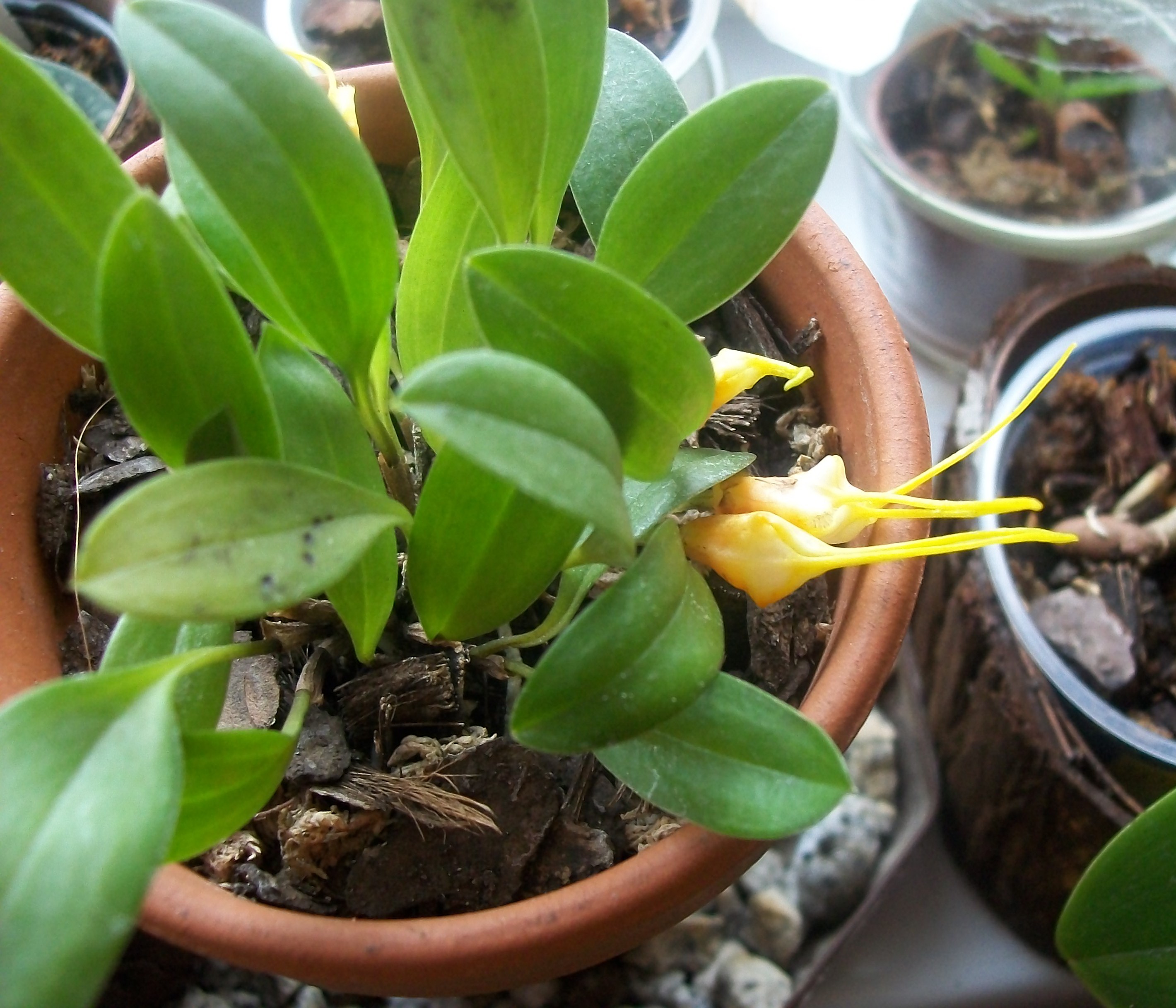 Ta Masdevallia jest ciepłolubna.Wprawdzie nocowała na dworze,gdy temperatura wynosiła 8 st.,ale tylko gdy zapomniałam.