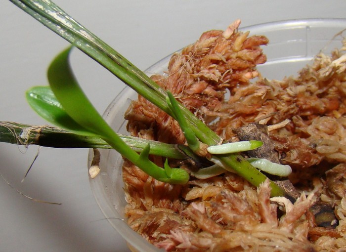 Roślina w sphangum po 3 tygodniach wypuściła nowy przyrost, który w chwili obecnej ma 2 cm, po kolejnych 3 tygodniach korzeń, dziś ma 3 korzenie ok. 2 cm wielkości.