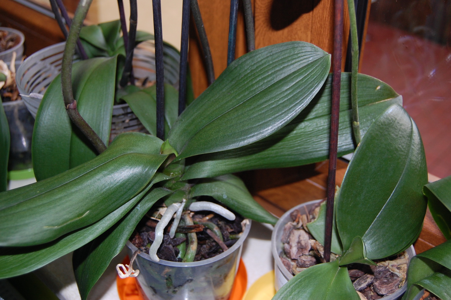 Dla mnie sporo Twoich storczyków jest odwodnionych (wiotkie liście, podłużne "wgniecenia" na liściach)- spowodowane jest to złym stanem korzeni (a raczej ich brakiem). Polecam podłoże ekstra z OS - gruba kora, skała wulkaniczna, bez ziemi lub mech sphagnum.