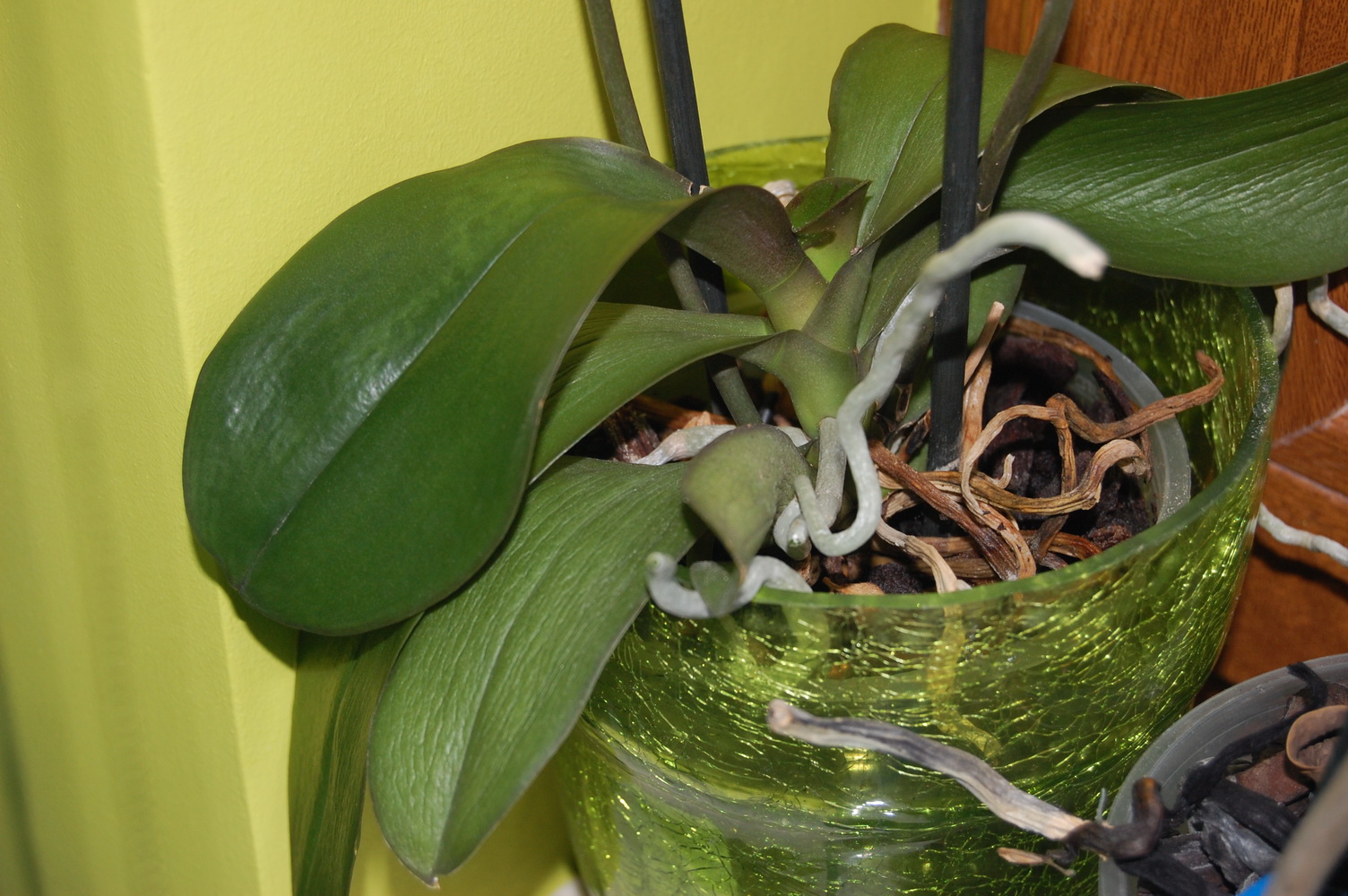 Sprawdzić czy korzenie nie zgniły, nie nawozić co podlewanie, i ja mocze 15 min a nie 40-60, zmienić podłoże kupić nową kore dla Orchidei.