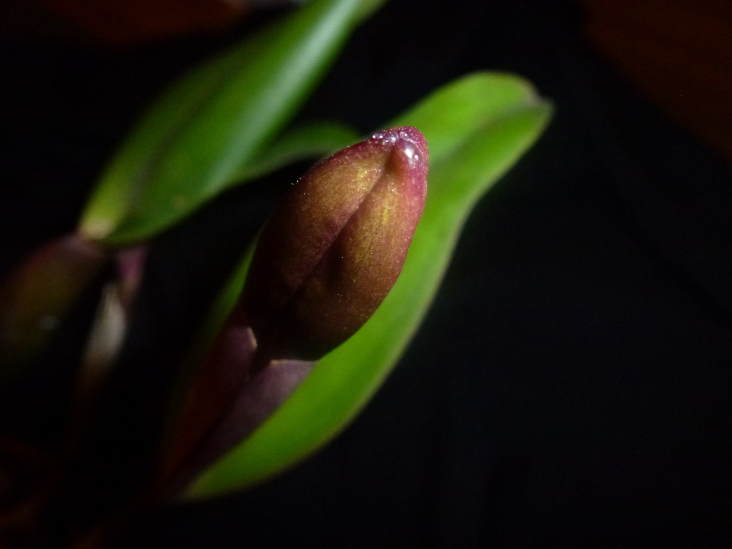 Mam ją od trzech lat, zakupiona u Schwertera. Trzy lata temu po zakupie nie oczekiwałam na kwitnienie. Poprzednie lato spędziła na dworze w niezbyt oświetlonej foliowej szklarence, przez lato urosły jej dwie psb , każda z nich miała pochewkę. Po dojrzeniu ich, na jesień zaczęły rosnąć kolejne dwie. Stała wtedy na południowym parapecie, ale miała chyba za ciepło przez grzejnik pod parapetem. Niestety zasuszyła zaczątki pąków w obu pochewkach. Podlewałam ją raczej sporadycznie, ze względu na te nowe przyrosty. Jeden przyrost urósł, ale niezbyt duży. Drugi dostał plam i go wycięłam... W tym roku znowu trafiła na dwór do szklarenki,ale w dość mocno nasłonecznione miejsce, przez co była cieniowana grubą firanką, która jak widać nie do końca pomogła. Nie obyło się bez oparzeń słonecznych. Przez lato dojrzał jej jeden przyrost, urosła pochewka kwiatowa. W czasie wzrostu pilnowałam podlewania i nawożenia. Tydzień temu przeniosłam ją z powrotem do domu na wschodni parapet, jest tam raczej chłodno, z powodu braku grzejnika. Korzeni na razie nie wypuściła. W tej chwili widać kawałek pąka. Mam dylemat, bo nie wiem czy zwiększyć jej ilość światła przez doświetlanie( nie zwiększając długość dnia) żarówką ledową 1300 lm, 3000K czy zostawić tak, jak jest. Wystawa jest wschodnia, ale słońce nie świeci tu zbyt długo. Nie wiem, czy mam jej już dostarczyć więcej wody czy raczej sporadycznie podlewać nie dopuszczając do wysuszenia "na wiór"..? Myślałam nad tym, żeby co kilka dni opryskiwać jej tylko podłoże na górze. Może ją wstawić do wyższej skrzynki z na dole zalanym keramzytem? Obecnie ma podstawkę z mokrym keramzytem, ale woda dość szybko wyparowuje.. Proszę o rady, jeśli ktoś wie co dalej z nią zrobić
