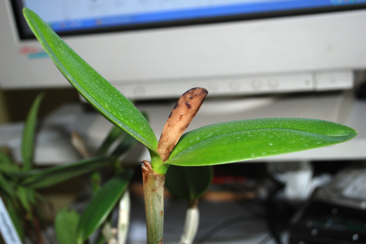 Dziwna ta zima jakaś, normalnie cat. intermedia teraz powinna odpoczywać. Ale nie moja. Chociaż ograniczyłem jej podlewanie, przez całą zimę wyprodukowała największy jak do tej pory przyrost. Pokazała się pochewka, w której, patrząc pod światło coś zaczęło się tworzyć. Nic tylko się cieszyć. Tydzień temu pochewka zaschła, a na osłonce psb pojawił się lepki, przeźroczysty płyn. Jak nic gutacja. Osłonka zaczęła sprawiać wrażenie przemoczonej. Tyle że ja nic nie pryskałem. Ten sam objaw jesienią skończył się u innej cattlejastej zgnilizną bakteryjną i ostrym cięciem szczątków. I też była w fazie kwitnienia, tyle że pąki zamarły już po wyjściu z pochewki. Na dodatek na liściu pojawiły się dwie małe ciemne plamki. Na razie jest spokój, nie powiększają się, miąższ liścia nie prześwituje, nie pojawiają się zażółcenia.