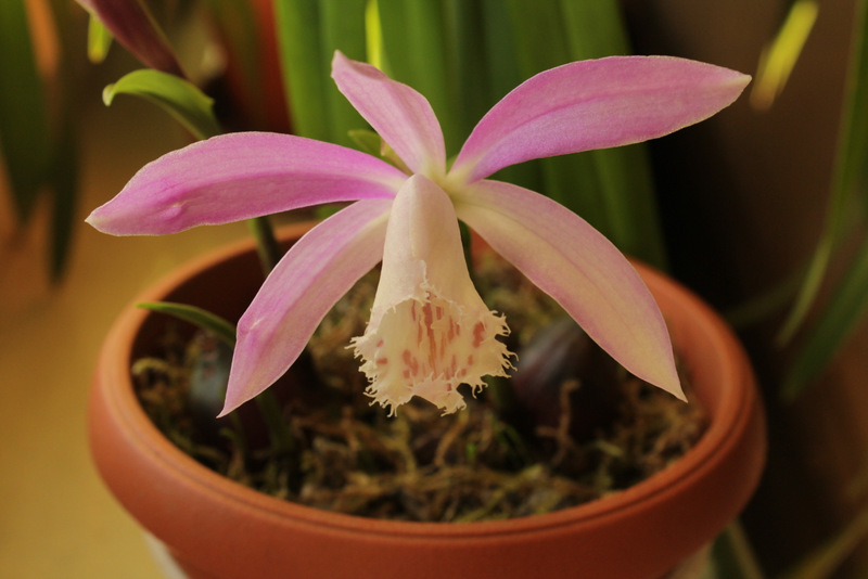 Zaczęły kwitnąć bulwki Pleione (podobno P. formosana), kupione na ostatniej wystawie w Łodzi, na stoisku z cebulkami bylin: