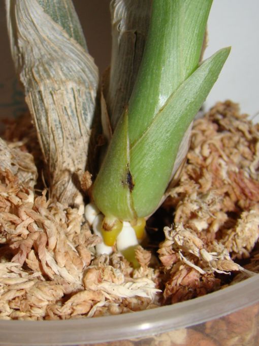 3. Do wyżej wymienionych operacji przystępuję wtedy, gdy nowy przyrost/przyrosty mają już minimalnie wykształcone korzonki. Jest to o tyle istotne, ponieważ nowe korzonki powinny mieć kontakt z nowym podłożem (nowa pbs może wyrosnąć przy podstawie starej pbs lub trochę wyżej). Dla zwiększenia wilgotności wokół nowej pbs i możliwości pobierania wody z podłoża wokół korzonków układam kilka kawałków sphagnum.