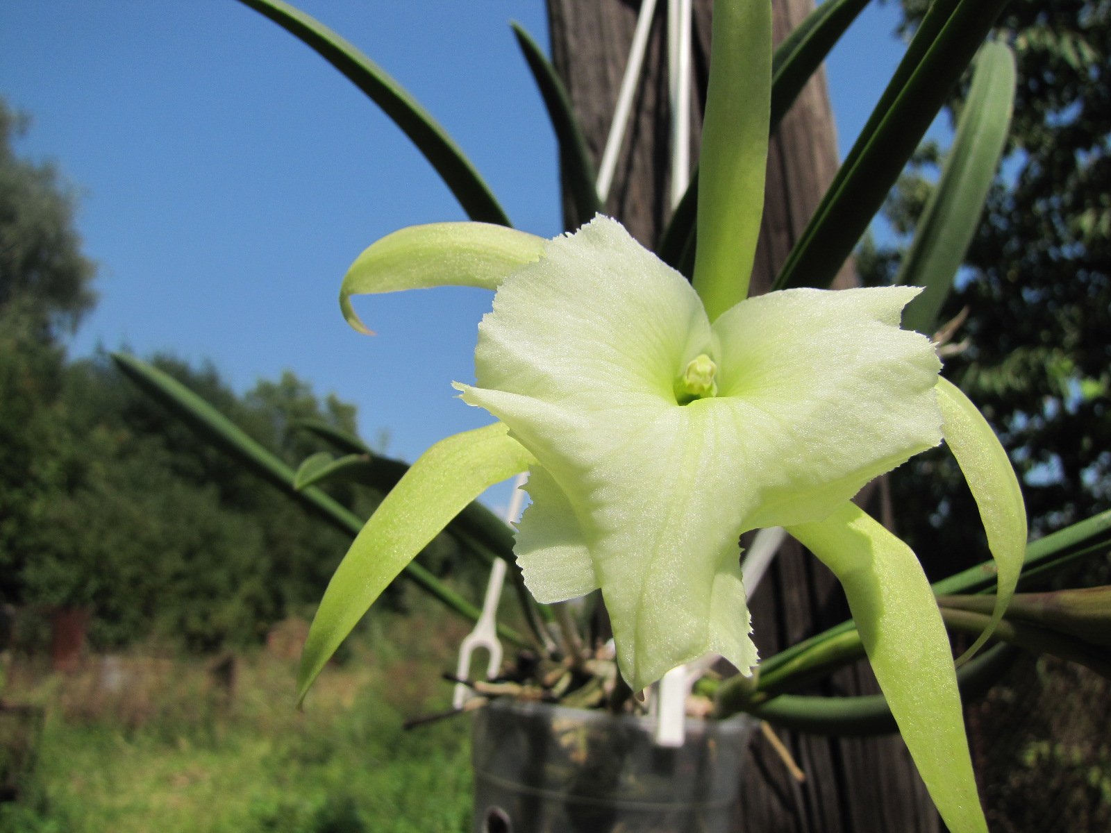 Właśnie dwa dni temu rozwinął się pierwszy kwiat Brassavoli Jimminey Cricket Super Bug. Jest to hybryda pierwszorzędowa Brassavoli nodosa i Rhynchovoli digbyany. Zakupiona na wiosnę 2014 roku w bardzo dobrym stanie zdrowotnym (wszystkie korzenie zdrowe :!: ). Zdecydowałem się na obsadzenie jej na kawałku czarnego bzu i tak "usztywnioną" umieściłem na podłożu korowym. W kwietniu wytworzyła 2 nowe przyrosty, nawożona mieszaniną biohumusu (tego który mi wykończył kilka phalaenopsisów) i Petersa 30-10-10. Nawadniana przez zatopienie na 15-20 minut, deszczówka + ok.10% wody wodociągowej. Doniczka z bocznymi otworami i grubym podłożem. Temperatura 25-30C, wilgotność 50-70%, słońce ok.10 godzin. Do zaindukowania kwitnienia nie wymaga obniżenia temperatury, kwitnie w sierpniu, kwiaty pachną w nocy, zapach bardzo przyjemny, konwaliowy, średnica kwiatu 12 cm.