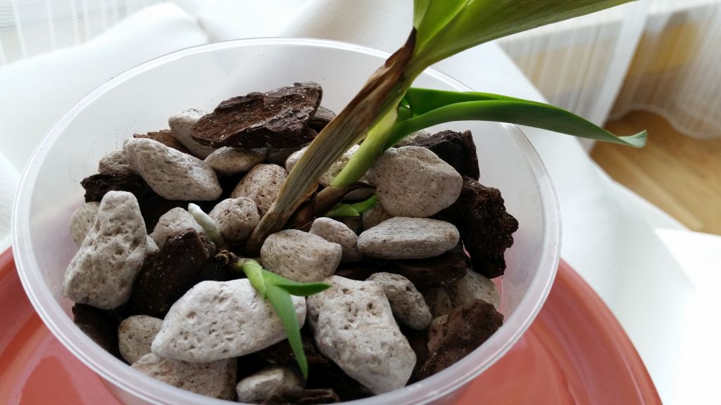 Pomimo pewnych problemów - liście zrobiły się trochę "szorstkie", to jednak cały czas wypuszczał nowe boczne pędy (bulwy?) z liścmi.