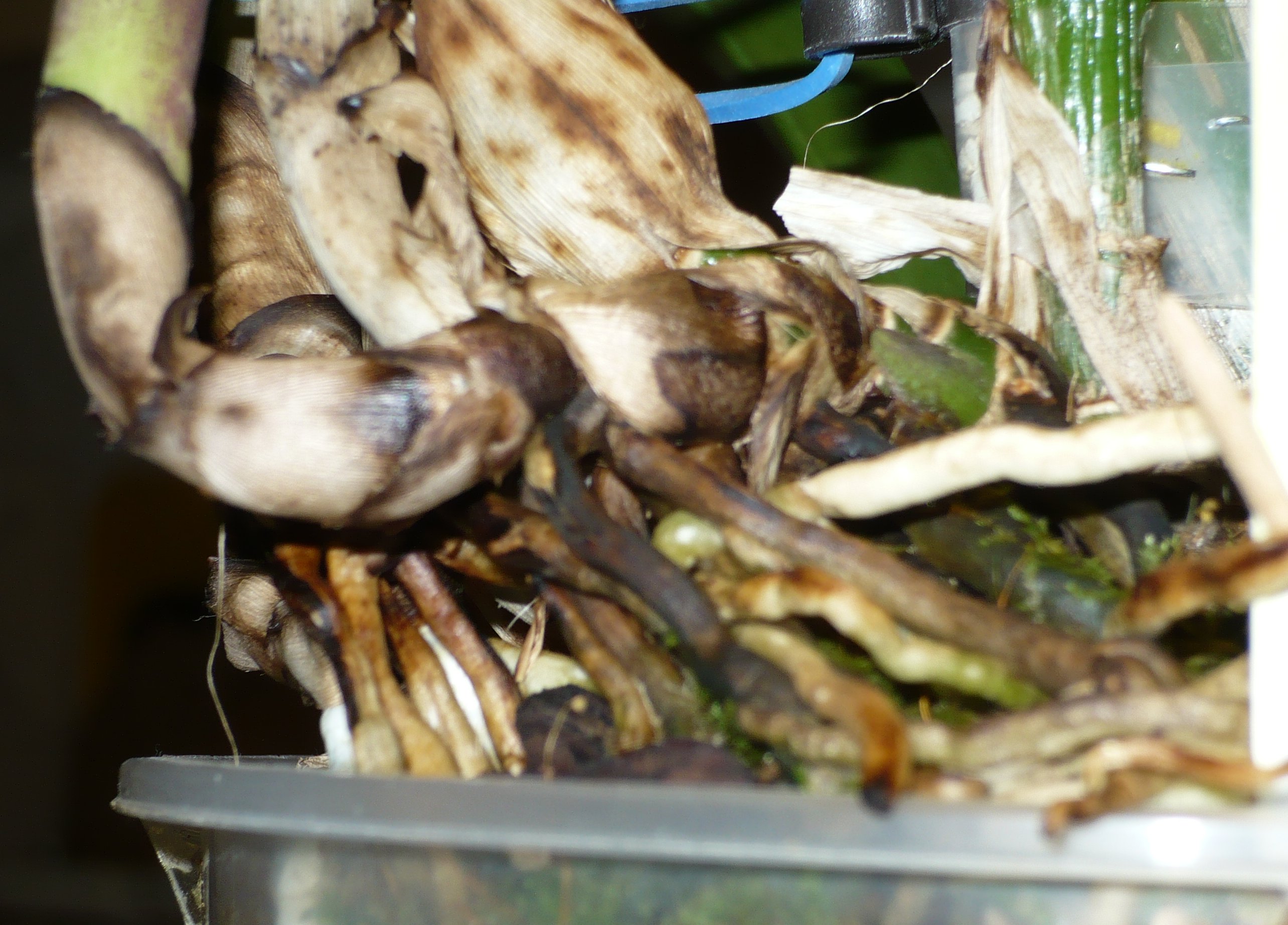 Zaraz po zakupie storczyk był przesadzony do przezroczystej, 15 cm średnicy, doniczki ze szczelinami i drenażem oraz typowym podłożem storczykowym, nasypanym tak, że nasady psb były w nim zanurzone. Kolejna psb zaczęła wyrastać od razu w górę, tak, że utworzył się pęd ok 1-2 cm nad podłożem. Jak wspominałem, pierwsza psb w 2014 r. wytworzyła pochewkę kwiatową, która zaschła pod koniec września. I prawie natychmiast wyrosła nowa psb, z której pąk wyrósł bez pochewki, a psb nawet nie wypuszczała korzeni, tak jej było pilno zakwitnąć :D .
