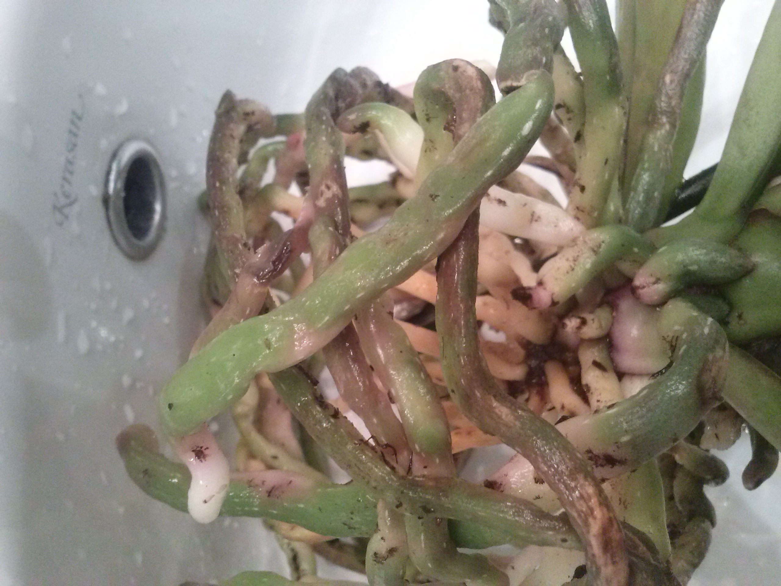 Zgadzam się z Titusem, dopowiem jeszcze, że kolor korzeni (białych) wynika z tego, że były w głębi doniczki i nie miały dostępu światła słonecznego- są zdrowe i w bardzo dobrej formie. Posadź do nowego podłoża i obserwuj