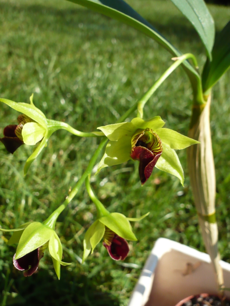 Kwitnienie letnie trwało ok. 2 miesięcy, prawdopodobnie wysokie, letnie temperatury przyspieszyły przekwitanie. Teraz na dwóch pseudobulwach ponownie wyrosły pędy kwiatowe, na jednym są dwa kwiaty, na drugim trzy pąki kwiatowe.
