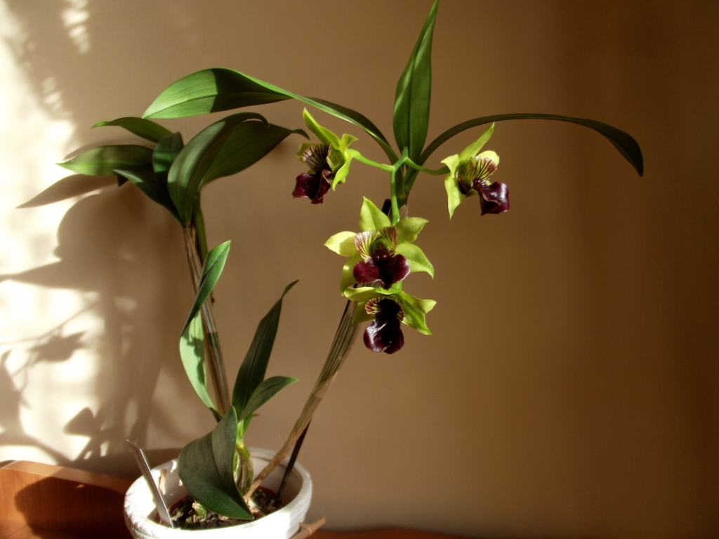 wiosną - latem trzymam na parapecie wschodnim, na zimę przenoszę na parapet południowy,żaby zaspokoić potrzeby słoneczne w tym okresie. To gatunek z sekcji Latouria, więc pędy mogą pojawić się z kilku miejsc na pseudobulwie - stąd tak częste kwitnienia :) Roślina nie przechodzi spoczynku zimowego,należy ją podlewać cały rok podobnie, oczywiście uwzględniając warunki i aurę zimą. W okresie wegetacji wody powinien mieć pod dostatek,tak,żeby psb były pękate. Generalnie bezproblemowa ;)