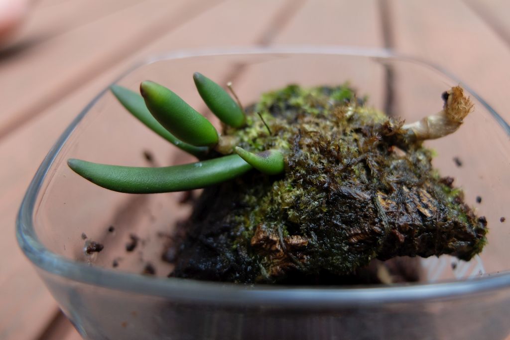 Od dwóch lat męczę się z takim maleństwem, a właściwie maleństwo męczy się ze mną. Trzymałem to w wilgotnym terrarium pod oświetleniem LED w temperaturze dzień noc 25/18 oC, przy wymuszonej wentylacji. Rosło ale słabo, nawet czasem kwitło. Liście które wyrosły u mnie były mniejsze od tych co były wcześniej. W czerwcu akwarium mi się rozszczelniło i wystawiłem je do ogrodu. Niefortunnie wybrałem miejsce i słońce spaliło mi kilka listków, prawie pół rośliny.