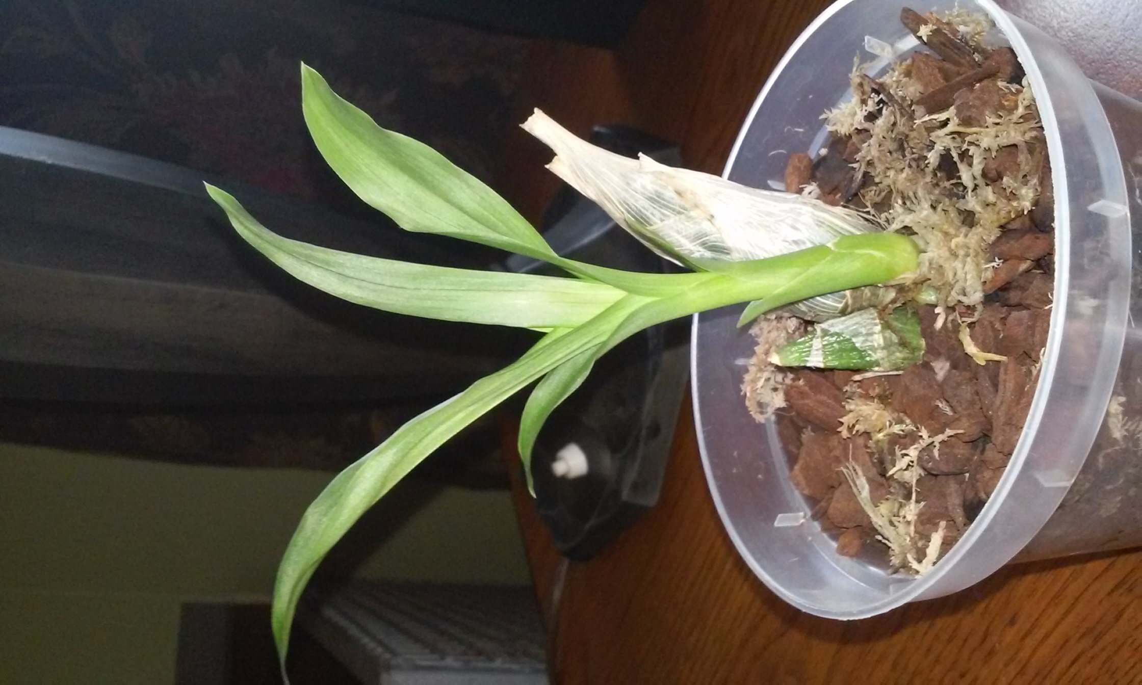 Po wielu dyskusjach i oglądaniu setek zdjęć, zaczynam podejrzewać, że to, co tam się pojawia w tym pęknięciu to może być kolejna pseudobulwa. To naprawdę niezwykłe, przecież ona jeszcze nie zrzuciła wszystkich liści i tu nagle pseudobulwa? Tak wcześnie?