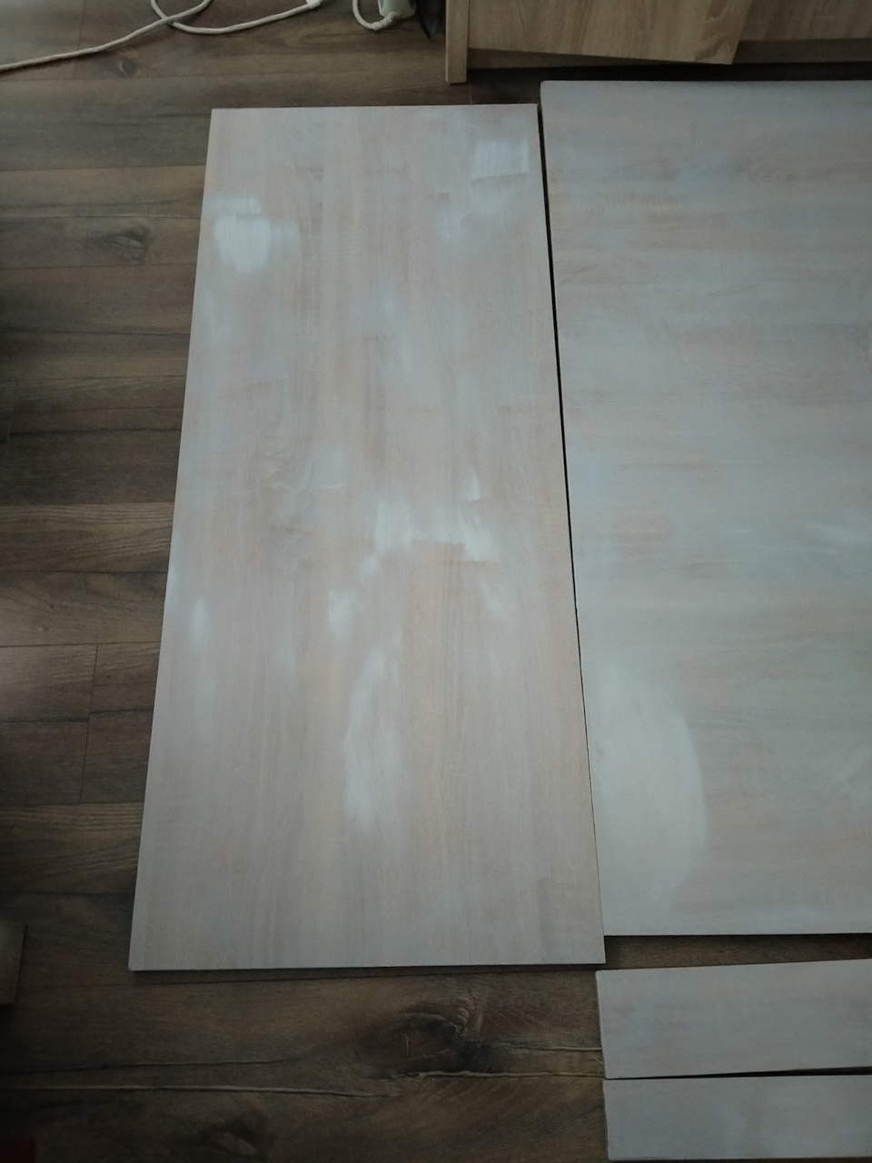 Elementy przed montażem okleiłem krawędzie okleiną i pomalowałem częściowo folią w płynie.