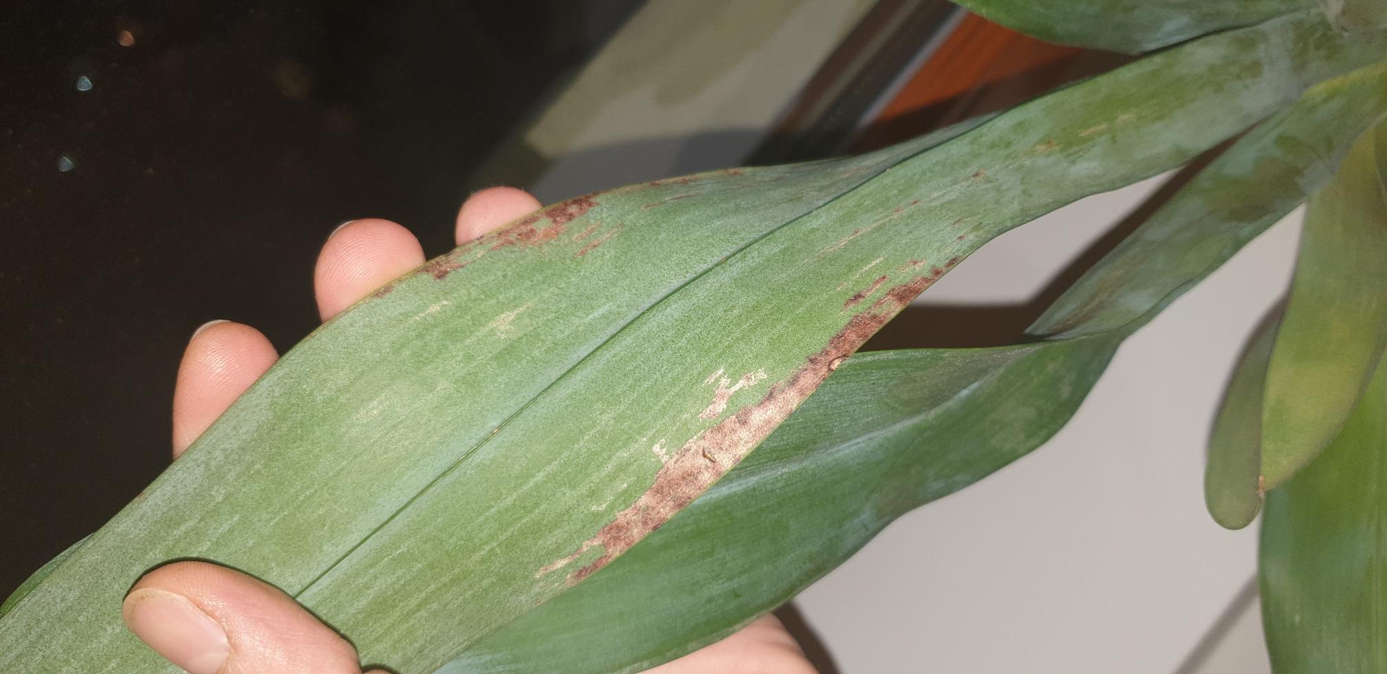 Najpierw chciałem się pochwalić pierwszym kwitnieniem mojego Angraecum, zakwitł po 6 latach od dostania w postaci keiki z dwoma listkami i jednym korzonkiem. Przy okazji wejścia na forum chciałem się zapytać, czy ktoś miał takie uszkodzenia liści od spodu? Pojawiły się stopniowo kilka miesięcy temu, teraz są i nic więcej się nie dzieje, poza tym, że młode liście mają niejednolitą zieleń.