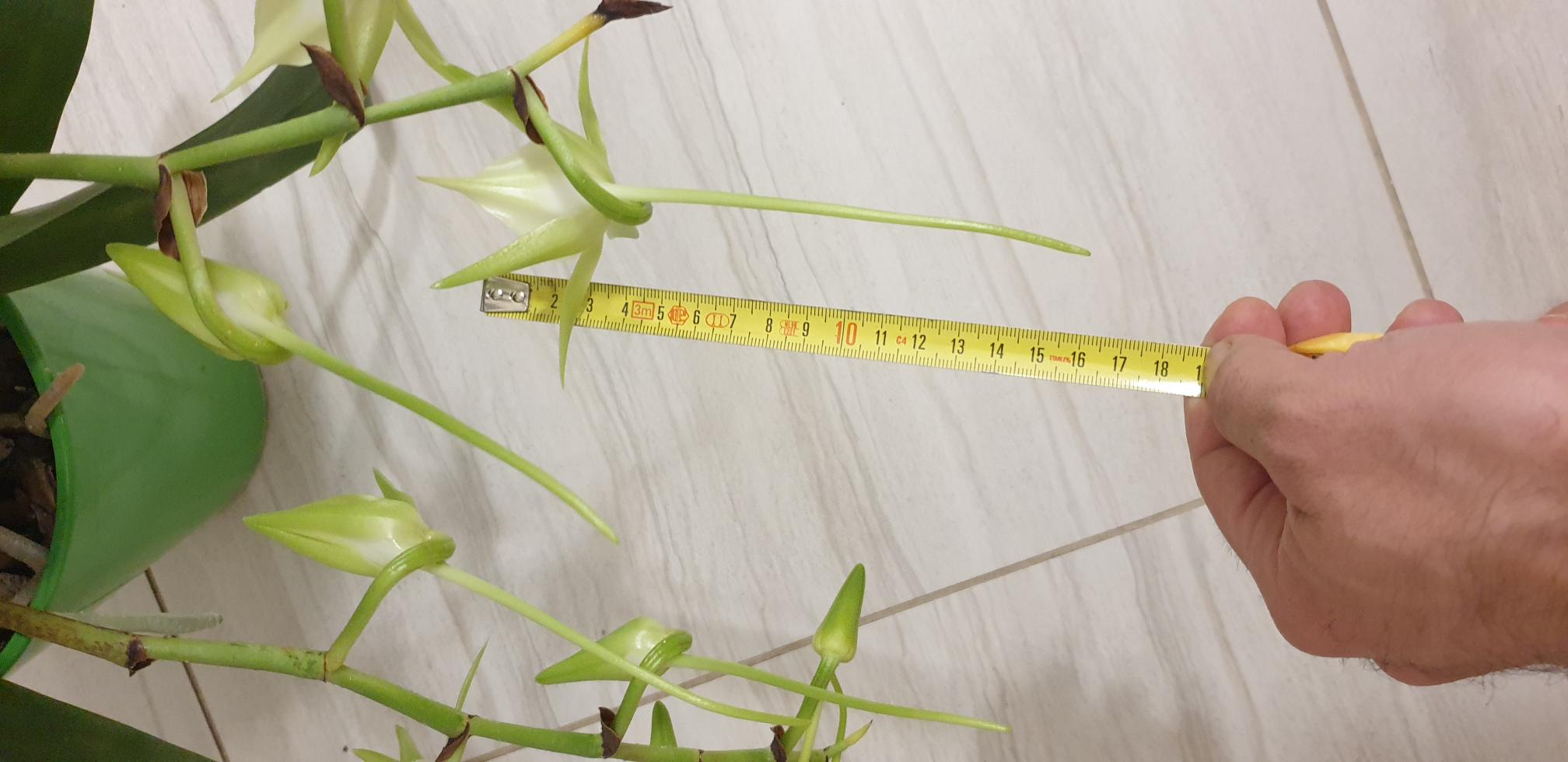 Najpierw chciałem się pochwalić pierwszym kwitnieniem mojego Angraecum, zakwitł po 6 latach od dostania w postaci keiki z dwoma listkami i jednym korzonkiem. Przy okazji wejścia na forum chciałem się zapytać, czy ktoś miał takie uszkodzenia liści od spodu? Pojawiły się stopniowo kilka miesięcy temu, teraz są i nic więcej się nie dzieje, poza tym, że młode liście mają niejednolitą zieleń.