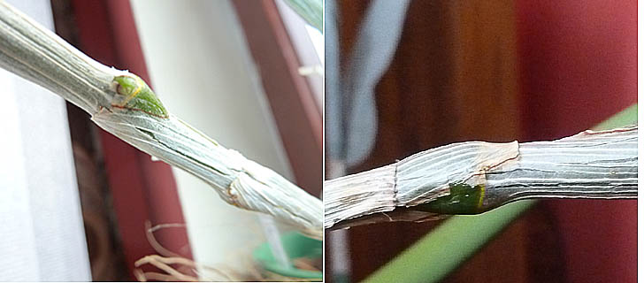 Dendrobium nobile w okresie wegetacji wymaga dużo rozproszonego światła, wody i nawozu. Jesienią wprowadzamy je w stan spoczynku-obniżamy temperaturę, ograniczamy maksymalnie podlewanie i zapewmiany jak najjaśniejsze miejsce. To są zaczątki, ale czego, jeszcze nie wiadomo. Wydaje mi się, że roślina po lewej ma większe szanse na wydanie kwiatów, a ta po prawej-keików. Już czas wybudzić to Dendrobium po lewej, więc możesz zacząć, Ryszard, podlewać. Nobile może kwitnąć przez cały rok, więc na pewno się nie spóźni ;) To, czy powstaną kwiatostany czy keiki, zależy w największej mierze od podaży wilgoci w okresie spoczynku.