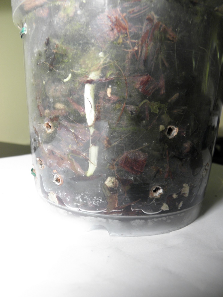 Mech jest tylko na powierzchni, był dodany już po przesadzeniu rośliny po sugestii Krzysztofa. Wyjściowo roślina była posadzona w podłożu zakupionym, składającym się głównie z włókien kokosowych, granulacja taka jak widać na zdjęciu 2011_12_11_2. Po sugestii Krzysztofa jedynie zdjąłem około 1cm górnej warstwy i poukładałem mech. Uwaga dotycząca ilości światła i temperatury skłoniła mnie do skonstruowania oświetlenia i tego całego inkubatora. W ogóle wszystkie sugestie były pomocne, jak na przykład ta żeby nie ruszać niepotrzebnie rośliną, bo gdy mało korzeni to cała roślina się przemieszcza i może dojść do uszkodzenia czubków delikatnych korzeni. Niestety nie doceniłem grzybów i nie przyłożyłem się odpowiednio do tego co radziła Mery. Jedynie raz opryskałem i podlałem roztworem Previcur. Zainfekowane stare liście już wtedy zaczynały żółknąc i po kilku dniach odpadły, więc stwierdziłem, że problem się skończył. Niestety odrodził się na tych najmłodszych liściach.